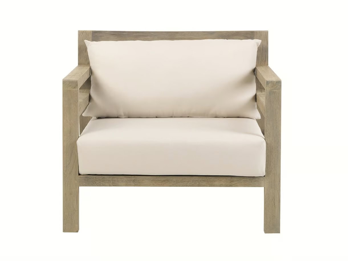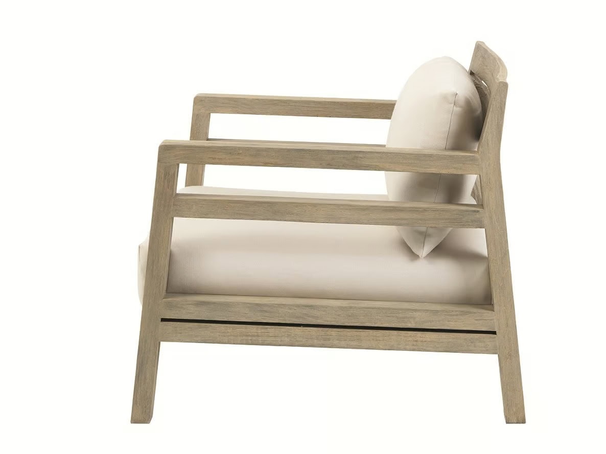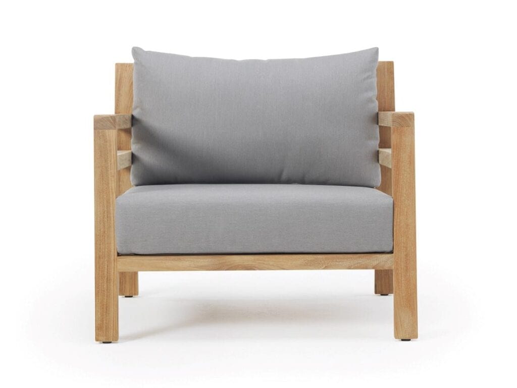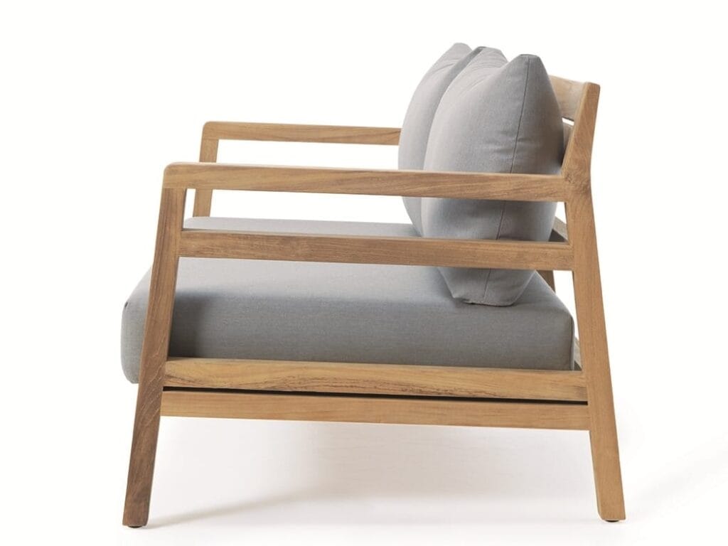 Sessel aus gebeiztem Teakholz oder lackiertes Mahagoni, 80x80 cm, komplett mit Sitz- und Rückenlehnenkissen.