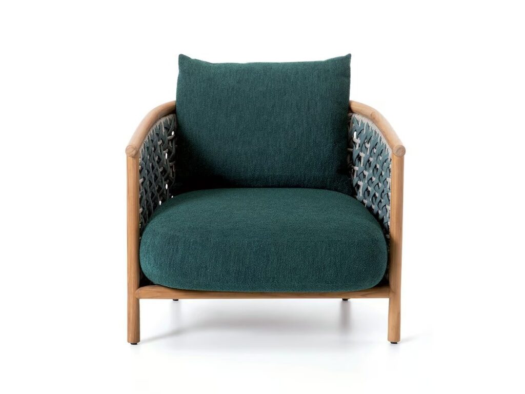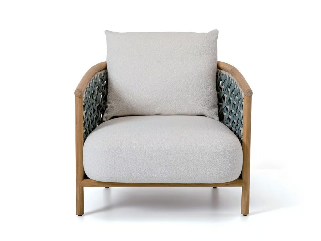 Patio ist ein Gartensessel mit einem Gestell aus natürlichem Teakholz und einer Rückenlehne aus Laguna und hellgrauem Flachkord. Kissen aus weissem oder dunkelgrünem Polypropylen.