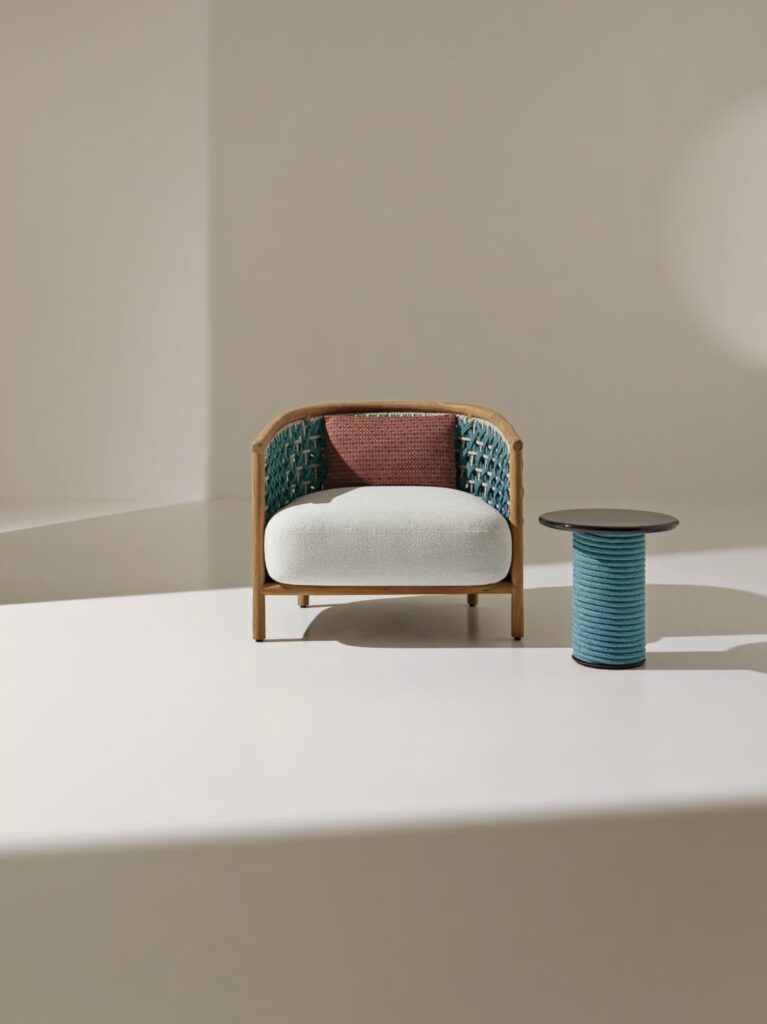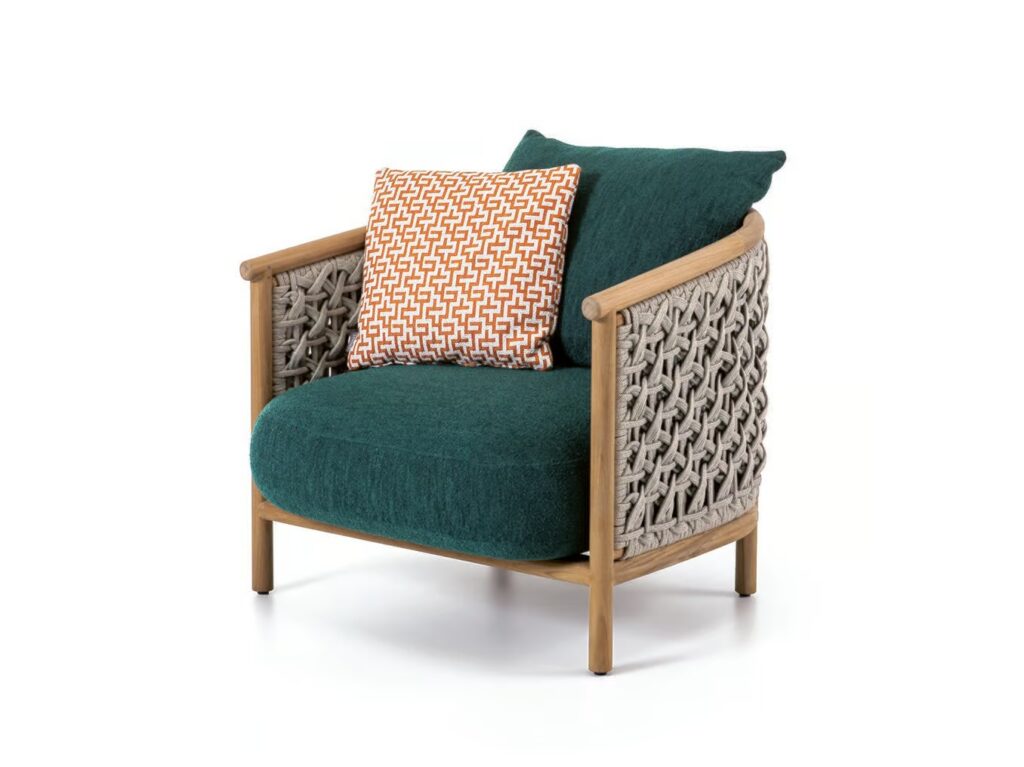 Patio ist eine neue Linie von Möbeln für den Aussenbereich, die sich durch den kreativen Einsatz von Flechtwerk in Verbindung mit der natürlichen Schönheit von Teakholz auszeichnet.