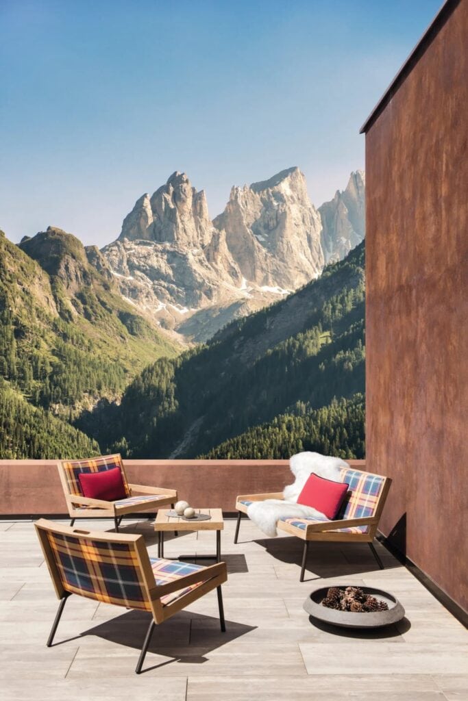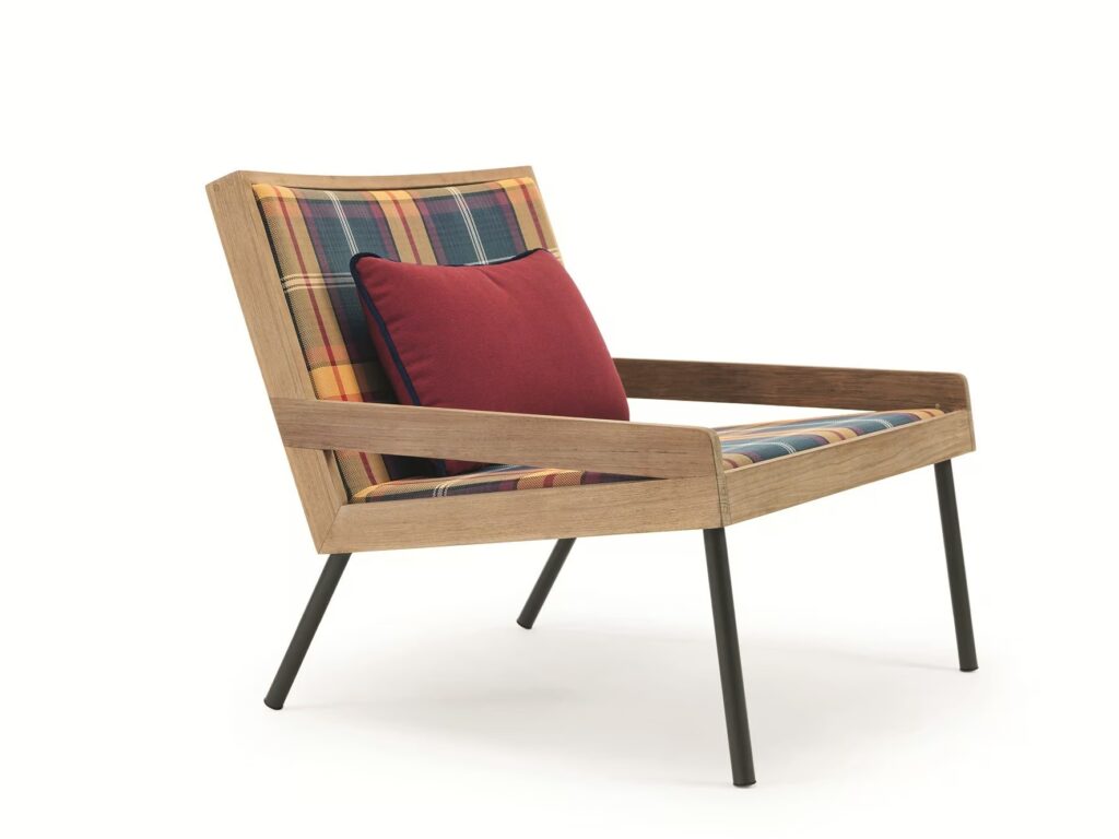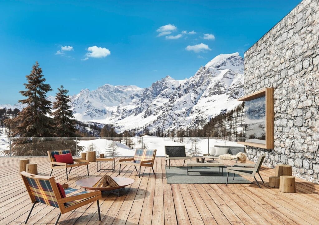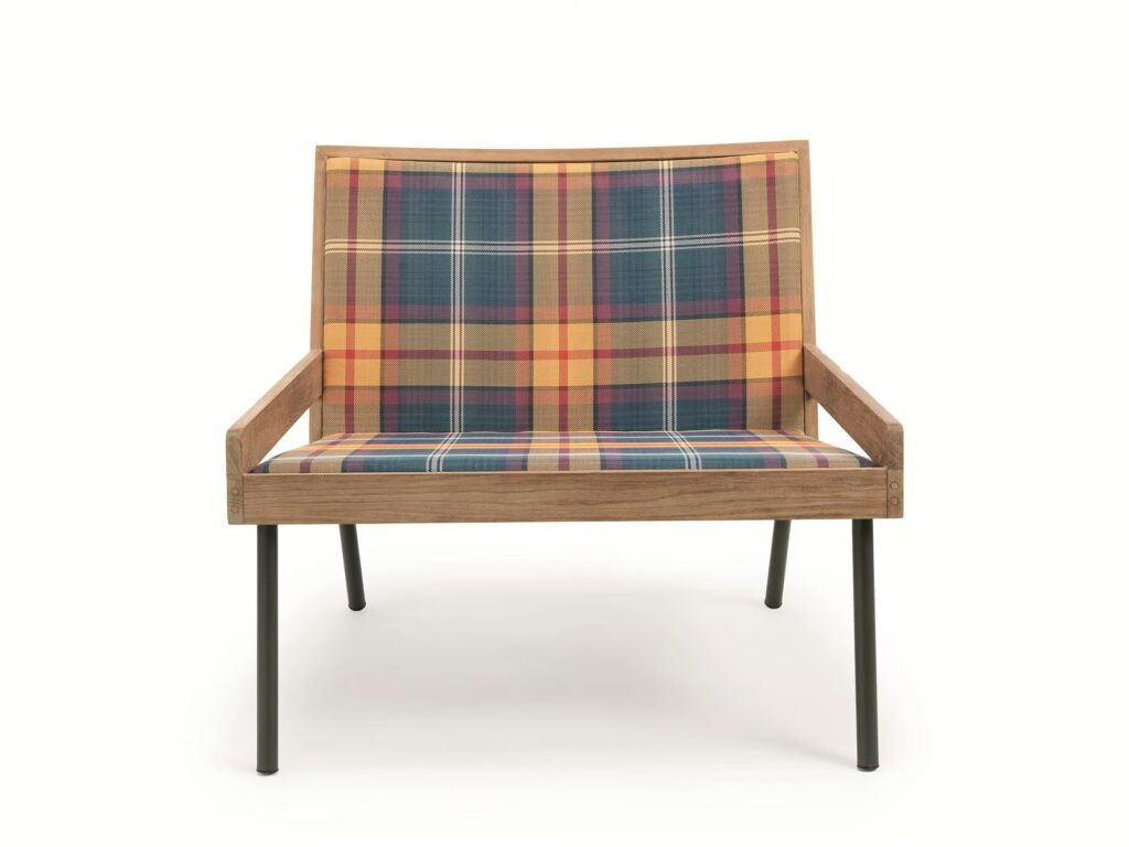 Die Kollektion Allaperto bietet massgeschneiderte Designelemente aus kaffeebraunem Metall, das mit natürlichem Teakholz und gepolstertem Ethitex-Stoff überzogen ist. Der speziell entworfene Tartan sorgt für maximalen Komfort und Langlebigkeit auch an den kältesten Orten.