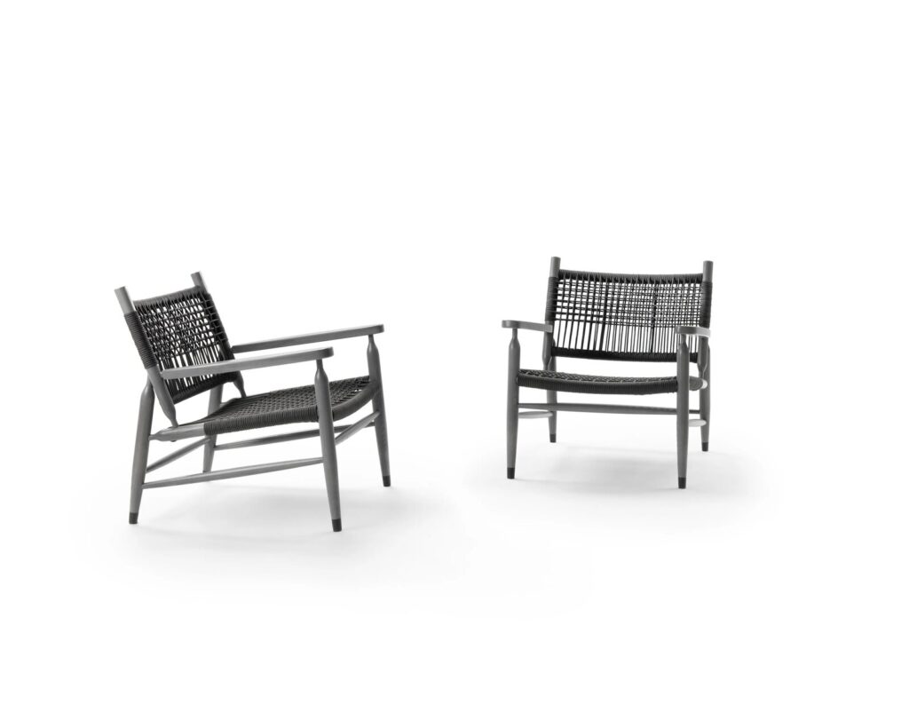 Gestell: aus Iroko-Massivholz in den Ausführungen Natur, gebeizt Grau, lackiert Weiß. Geflecht aus nylonverstärktem PVC-Schaum in den Farben Anthrazit 7005, Bordeaux 7002, Weiß 7007, Creme 7001, Braun 7004, Grün 7006; oder mit Polypropylenschnur in den Farben Sand 8001, Anthrazit 8005, Bordeaux 8002, Grün 8006, Weiß 8007, Braun 8004; oder aus Polypropylenschnur matt in den Farben Natur 8102, Eisblau 8103, Anthrazit 8105, Strohgelb 8101.
