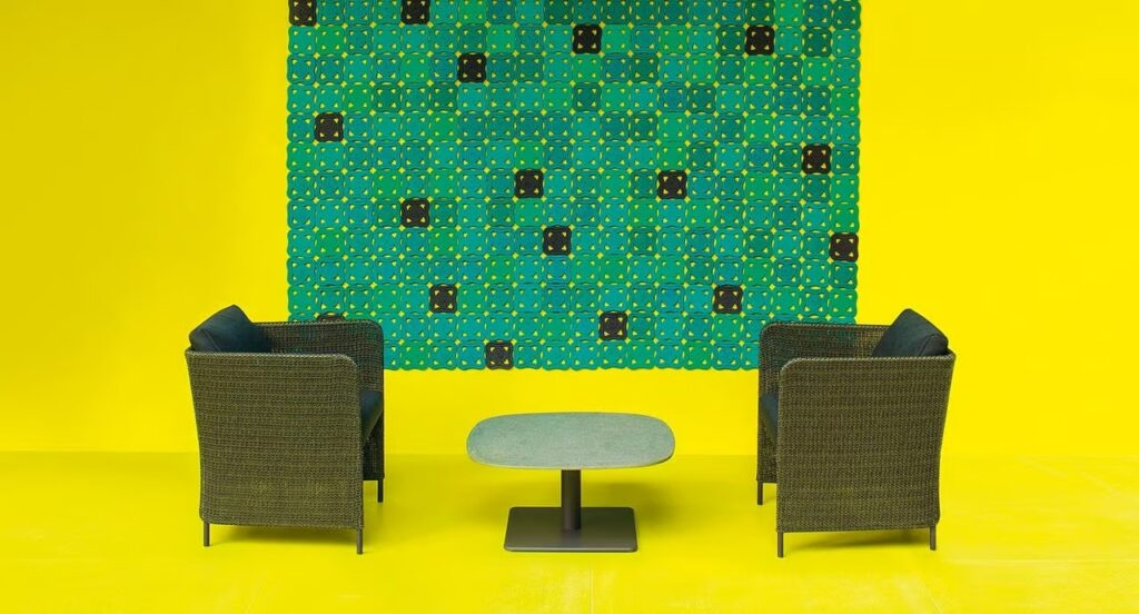 Die Kollektion Teatime besteht aus einem Sessel sowie 2- und 3-sitzigen Sofas. Das Gestell aus korrosionsbeständigem, Pulverlackiertem Stahl ist mit dem neuen Stoffe Thuia von Paola Lenti bezogen. Der Stoff ist Licht-, Luft- und Wasserdurchlässig. Der offene Schuss, die Semitransparenz und die natürliche Anmutung des Stoffes bieten dieser Kollektion eine angenehme Leichtigkeit. Ideal für freundliche, ruhige Momente im Garten oder auf der Terrasse, ist die Serie Teatime auch für Innenbereiche mit geeigneten Sitz- und Rückkissen erhältlich, die in einer breiten Stoffpalette bezogen werden können.