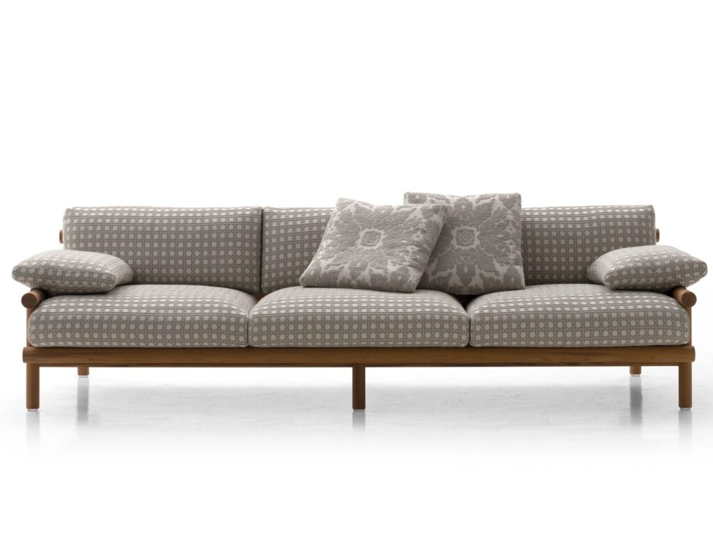 Die minimalistische und innovative Kollektion Ayana ist ein neues Kapitel in der Geschichte, die B&B Italia mit Naoto Fukasawa verbindet. Der Protagonist ist das Holz, das auf ungewöhnliche Weise interpretiert wird, mit einem angenehmen orientalischen Touch. Während die Tiefen und Höhen eine klare Referenz an die südostasiatische Tradition darstellen, erinnert die Rückenlehne an eine schwedische Sprossenwand, ein Trainingsgerät, das zu einem tragenden Element umfunktioniert wurde. Dank dieser Lösung können die Elemente der Ayana-Kollektion in einem 360-Grad-Winkel genossen und geschätzt werden, wobei auf jeder Seite ein neues elegantes Zusammenspiel von Überschneidungen und Proportionen zu entdecken ist. Die zwei- und dreisitzigen Sofas und der Sessel haben Armlehnen in unterschiedlichen Höhen. Die Armlehne des Sessels ist höher, um einen ergonomischeren Sitz zu gewährleisten. Die Armlehne des Sofas, die niedriger ist, kann mit einem Kissen kombiniert werden, das sich leicht befestigen und abnehmen lässt und bei Bedarf ein bequemeres Sitzen ermöglicht. Die Polstermöbel dieser Kollektion zeichnen sich durch individuelle Kissen aus, die alle mit wasserfesten Stoffen bezogen sind. Der warme Minimalismus von Ayana wird durch einen Stuhl, einen Esstisch und einen niedrigen Tisch ergänzt. Der Esszimmerstuhl greift die stilistischen Merkmale der anderen Sitzgelegenheiten auf, um ein perfektes Familiengefühl zu schaffen, mit einer Struktur aus natürlichem Teakholz und zwei großzügig gepolsterten Kissen mit Stoffbezug. Der Tisch besticht durch seine ovale Platte aus Serpentin, einem typischen Stein der Alpen. Die tragende Struktur aus natürlichem Teakholz wirkt leicht, ist aber äußerst robust, wetterfest und trägt die schwere Platte. Auch der Couchtisch hat eine runde Struktur aus natürlichem Teakholz mit einer Platte aus Serpentin. Seine großzügigen Abmessungen ermöglichen es, eine angenehme, gesellige Atmosphäre im Außenbereich zu schaffen. Ayana ist ein Projekt mit einer grünen Seele. Das für die Herstellung der Strukturen verwendete Teakholz ist FSC-zertifiziert (Forest Stewardship Council) und alle Materialien, aus denen die verschiedenen Elemente der Serie bestehen, können am Ende des Lebenszyklus des Produkts getrennt und umweltgerecht entsorgt werden.