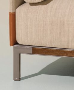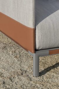 Baia ist ein Sofa für den Aussenbereich, das mit Stoffen in neutralen Farben gepolstert ist, die mit maritimen Lederdetails kombiniert sind. Alle Materialien wurden aufgrund ihrer stilistischen und ästhetischen Qualitäten ausgewählt, die sicherstellen, dass sie sich in jeder Situation im Freien bewähren und dass die Möbel im Laufe der Zeit ihre ursprüngliche Schönheit und Funktion behalten.Die Polsterung ist wasserabweisend und mit einer speziellen Technik "versiegelt", so dass das Wasser abperlt und nicht eindringen kann. Alle Kissen und Armlehnen haben leicht abnehmbare Bezüge und das Leder ist umweltfreundlich und speziell für den Aussenbereich geeignet.