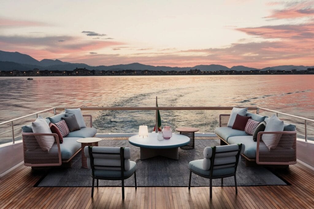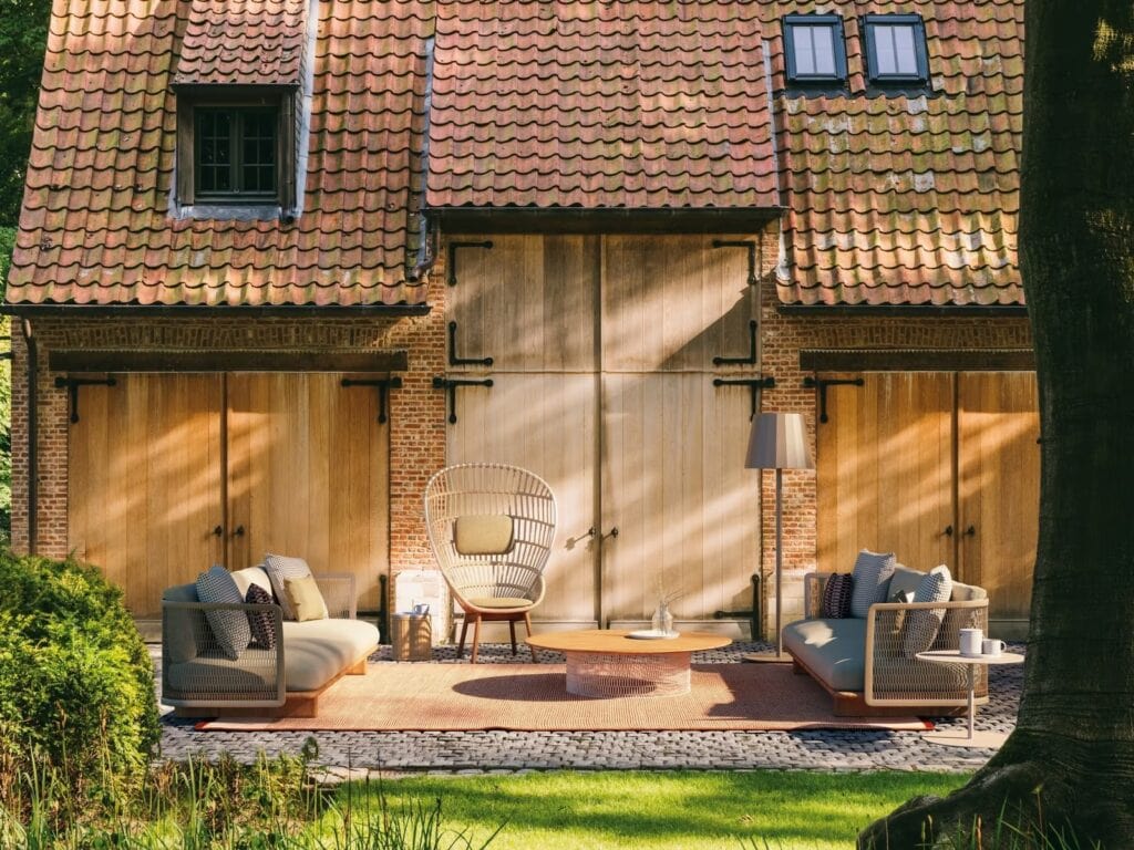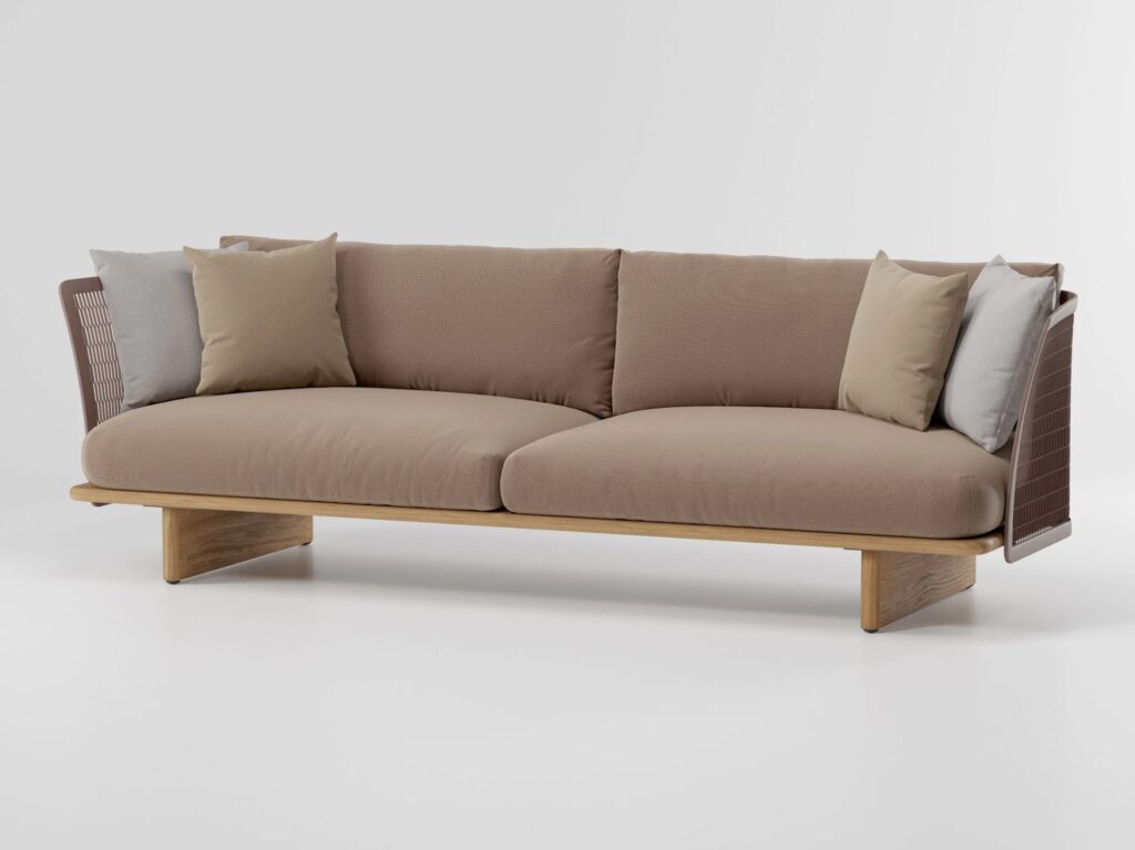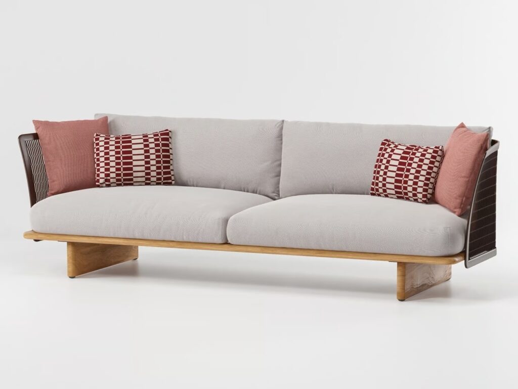 Das solide Sofagestell aus Holz und die voluminösen, äußerst bequemen Polster schaffen auch im Außenbereich einen besonderen Wohnkomfort.
