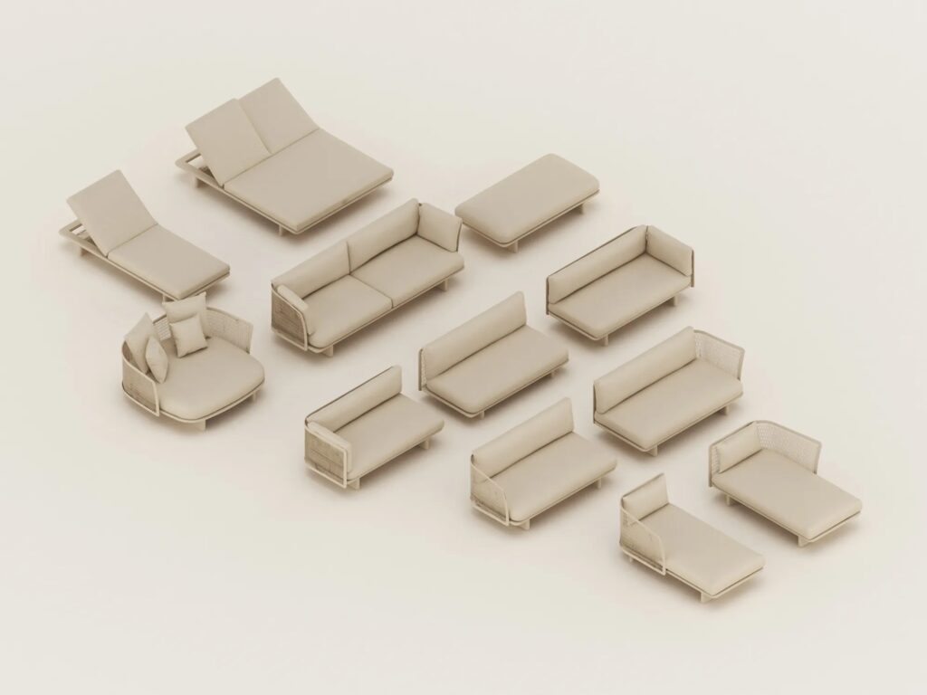 Diese Kollektion mit Gitterflächen erinnert an Gebäudefassaden, die die Umgebung filtern und trotzdem licht- und luftdurchlässig sind. Industrielle und natürliche Materialien, harte und weiche Oberflächen sowie transparente und massive Elemente wurden beim Entwurf dieser Outdoor-Möbel kombiniert, die mit spannenden Kontrasten aufwarten. Das bei den Tischen und Rückenlehnen der Sofas verwendete Streckmetall sorgt für eine gewisse Leichtigkeit und dient gleichzeitig als Unterbau für Tischplatten aus Holz und Marmor bzw. diverse Sofakissen. Die sanfte Rundung der Sofaseiten verleiht dem industriell anmutenden Rahmen eine gewisse Zartheit und lädt zu einem erholsamen Mittagsschlaf ein.