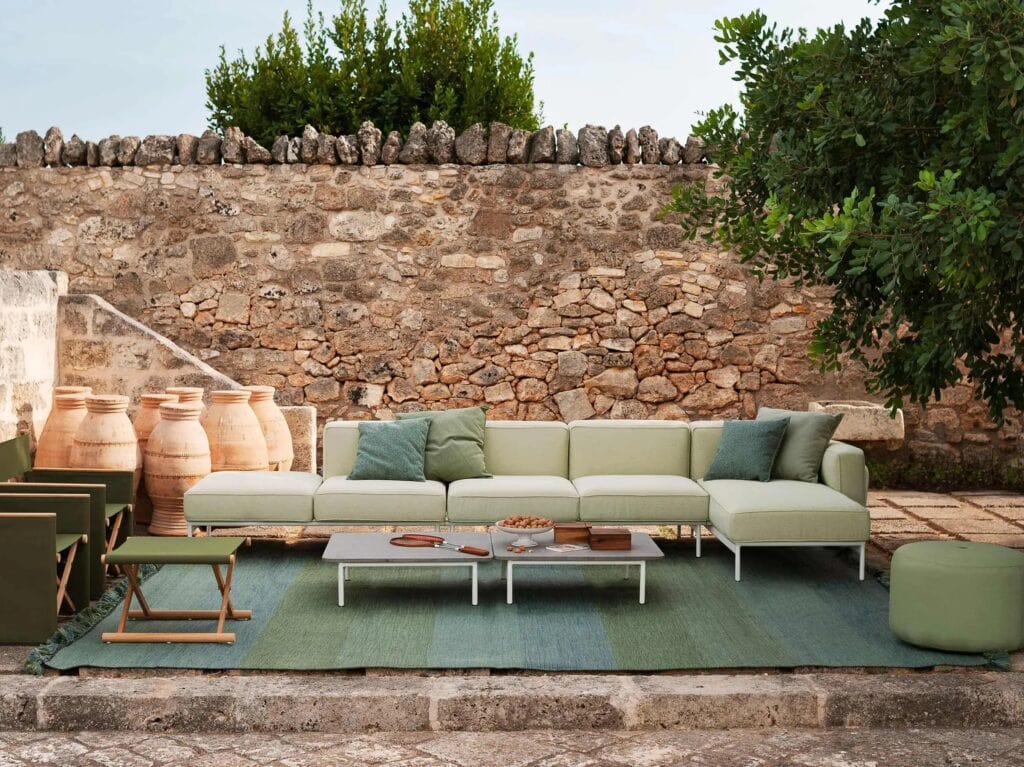 3 ESTENDO is a corner garden sofa with a chaise longue and a coffee table.