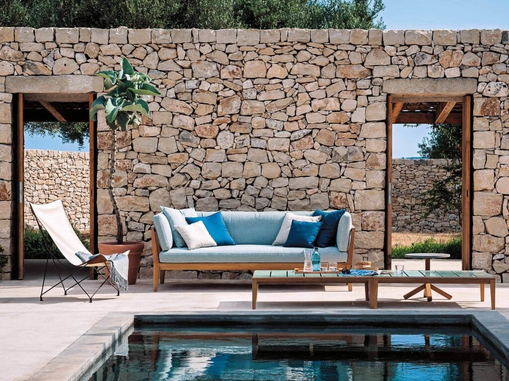 The sophistication of the design behind these outdoor sofas is also reflected in the details, such as the use of buttons that, fitting perfectly between the slats of the backrest and armrests, prevent the cushions from shifting with an original aesthetic touch.