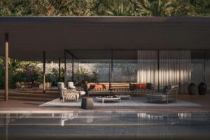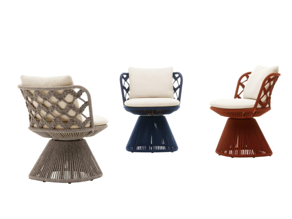 Der Stuhl FLAIR O' OUTDOOR zeichnet sich durch einen leichten Aluminiumrahmen aus, der vollständig mit einem Geflecht aus Polypropylenbändern überzogen ist, die in einem sorgfältigen handwerklichen Verfahren hergestellt werden. Insbesondere die Rückenlehne wird auf einem speziellen kreisförmigen Webstuhl (Tombolo) nach einer alten Technik gewebt, die typisch für das Gebiet ist, in dem sich der Hauptsitz von B&B Italia befindet. Für die Feinabstimmung hat Monica Armani mit unPIZZO zusammengearbeitet, einem in Cantù ansässigen Designstudio, das sich auf die Wiederbelebung und Weiterentwicklung traditioneller Webtechniken spezialisiert hat, die in einer zeitgemäßen Form auf den Einrichtungssektor übertragen werden. Die in raffinierten Farbtönen erhältlichen Strukturen werden durch zwei gepolsterte Kissen ergänzt, die die Form definieren und noch mehr Komfort bieten. FLAIR O' OUTDOOR wird in zwei Höhen angeboten, die zu den beiden Höhen der Allure O' Outdoor-Tische passen: eine klassische Sitzhöhe und eine weniger imposante, die mehr der Entspannung gewidmet ist.