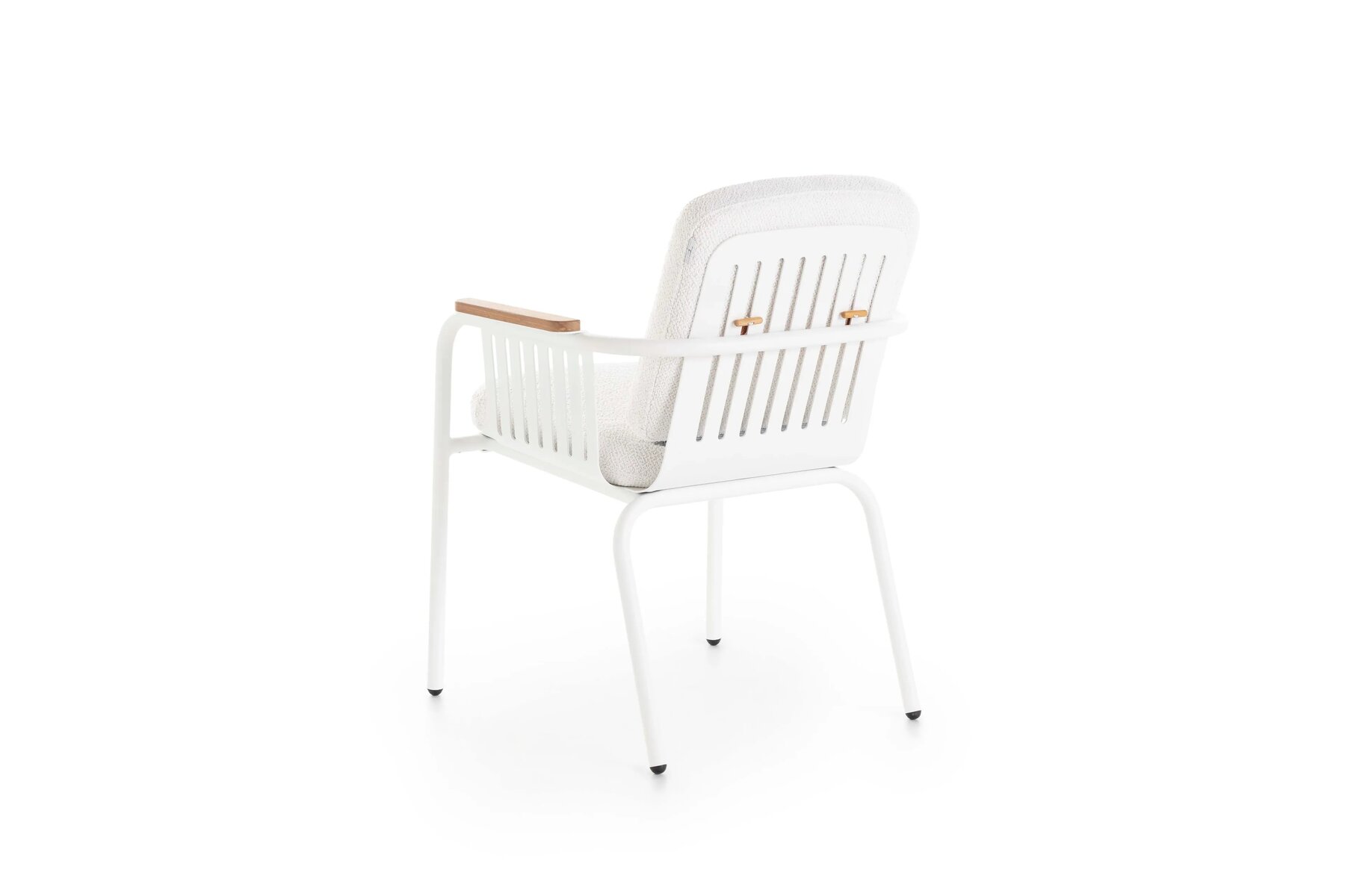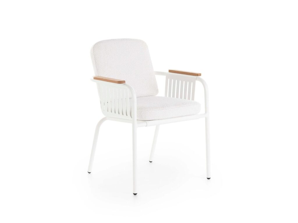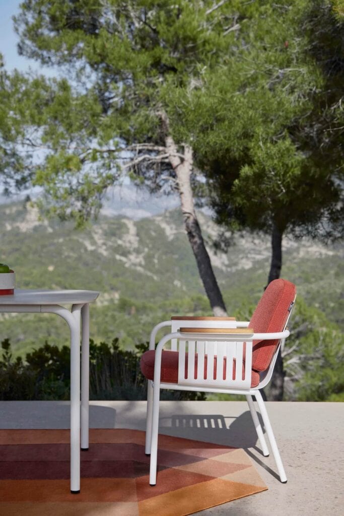 Der Esszimmerstuhl CAPA ist ein Designerstuhl mit einer leichten Struktur aus Rohrprofilen und laser-geschnittener gelochter Aluminiumblech, während seine Armlehnen wahlweise aus Iroko-Holz oder Dekton®-Porzellanmaterial von Cosentino erhältlich sind. Die Kissen dieses exklusiven Stuhls sind bequem und widerstandsfähig, ideal zum Geniessen von entspannenden Momenten sowohl im Garten oder am Pool als auch für grosse Vertragsflächen von Hotels oder Restaurants.