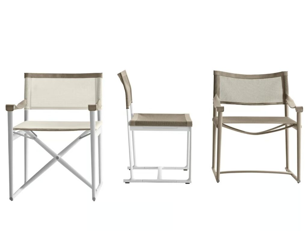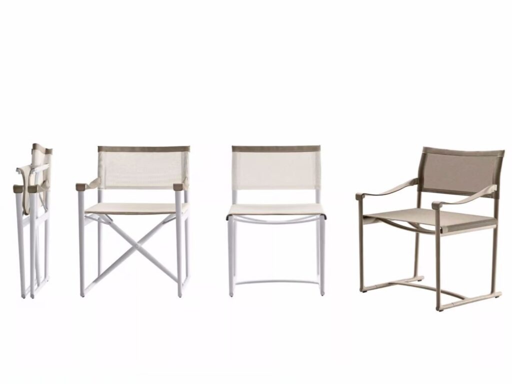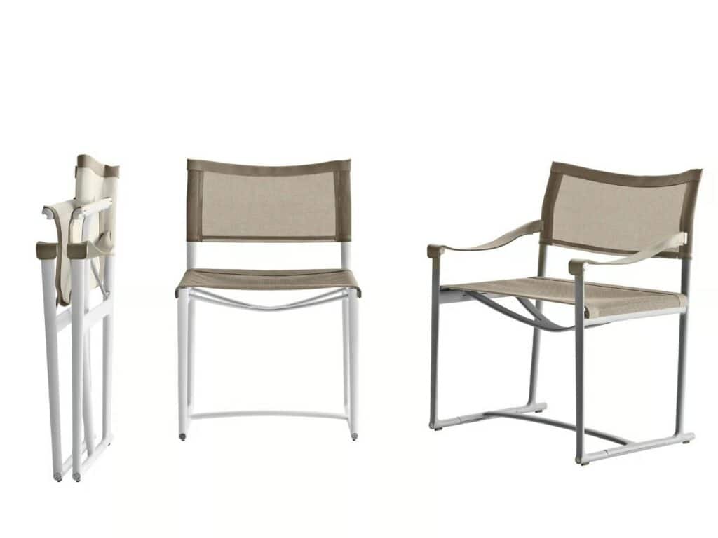 Ein Klassiker ist geboren der die stabile Eleganz seines Autors entspricht. Verschiedene Produkten gehören zu dieser Kollektion: Sessel, Stühlen und eine Liege mit verstellbaren Rücklehne. Der Klappstuhl bearbeitet den klassischen Regisseur-Stuhl neu, mit neuen und sorgfältigen Details. Tische, Beistelltische und Konsole haben dieselbe Gestelle aber die Platte in Blech lackiert oder mit Iroko natur gebürstet Daube. Zwei sind die Farben der Kollektion: weiss und tortora, sowohl für das Netz als auch für die metallische Teilen. Die gelten für einfarbige oder mit kontrast- Keder Einrichtungen.