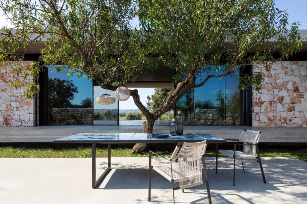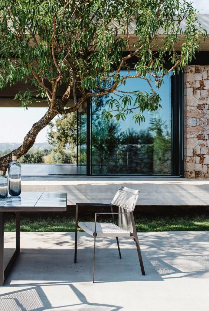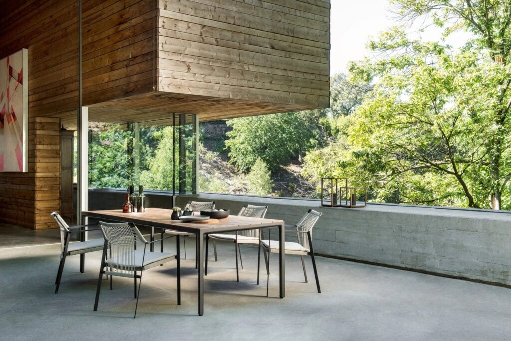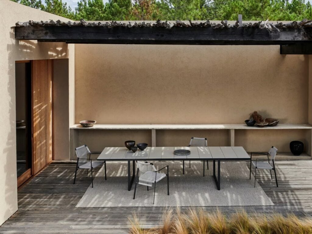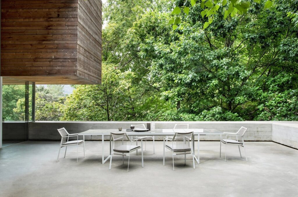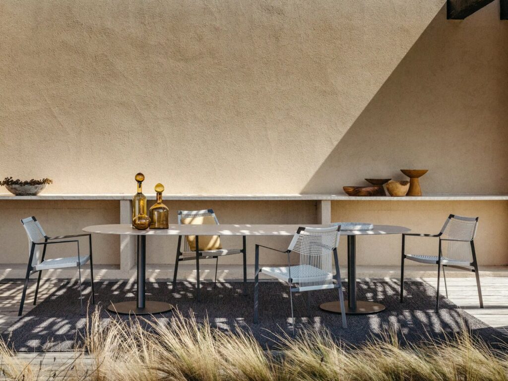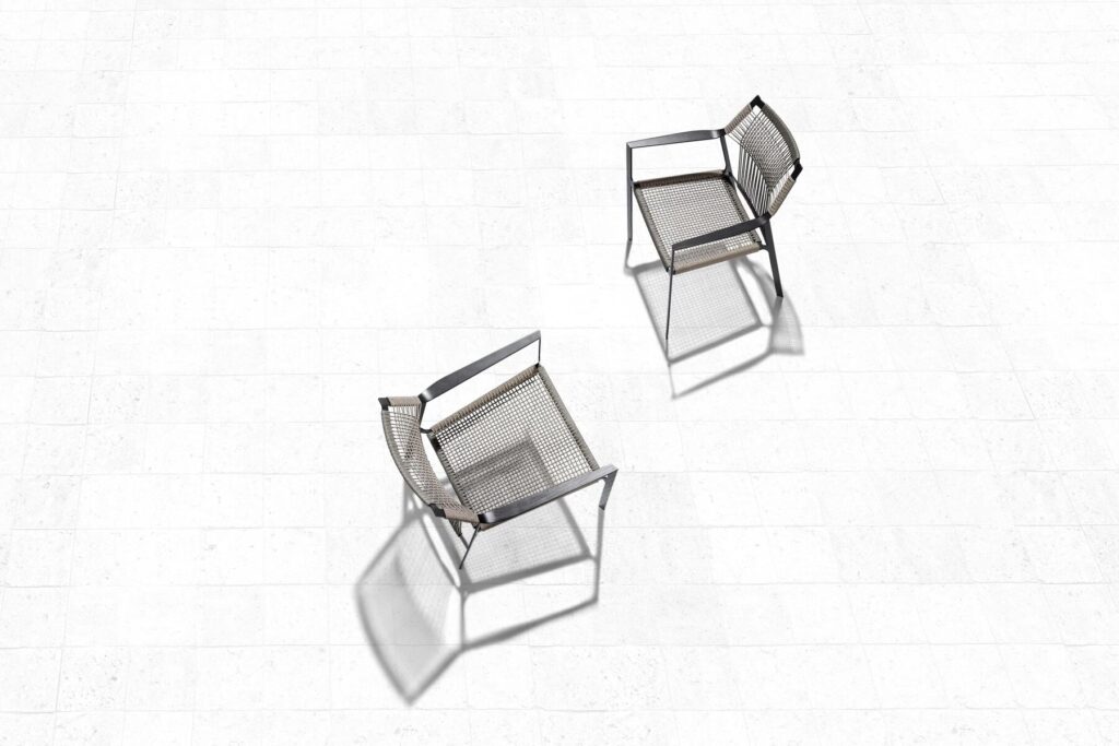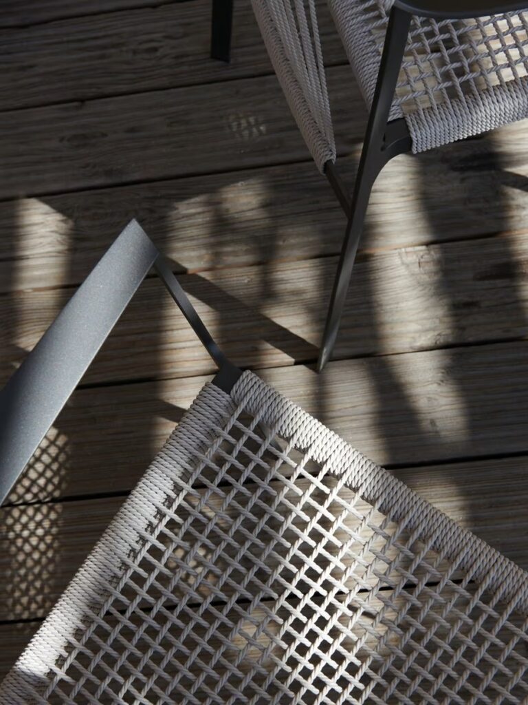 Die leichte Silhouette des Nodi Stuhls verdankt sich dem gedrehten Draht aus witterungsfestem Canax®, das geometrisch über ein schlankes, skulpturales Gestell aus pulverbeschichtetem Edelstahl gezogen ist. Raffinierte Proportionen und der minimalistische Umgang mit Materialien verleihen der Kollektion eine zwanglose Leichtigkeit.