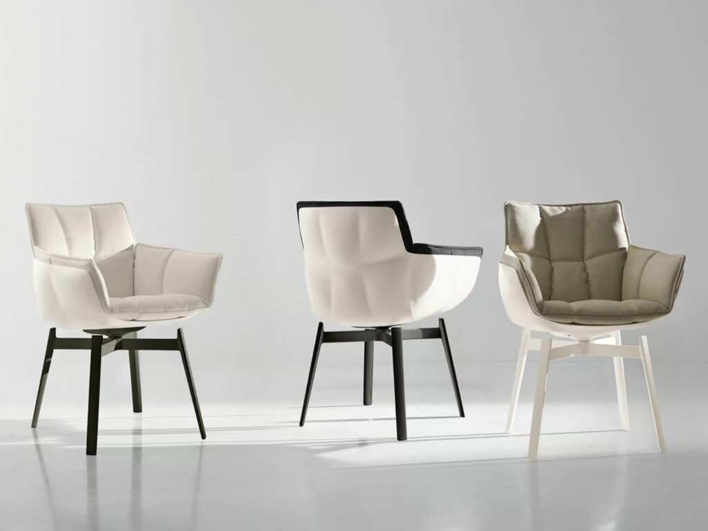 Die neue esszimmerstuhlversion ergänzt die Husk Outdoor kollektion, die jetzt verschiedenen bedürfnissen entsprechen kann sowohl bezüglich raumverfügbarkeit als auch bezüglich zweckmässigkeit. Die schale ist nur in der farbe weiss lieferbar, die zur helligkeit des outdoor bereiches gut passt; die vier beine sind aus metall weiss oder schwarz lackiert, während das kissen, das wasser nicht aufsaugt und der rückenlehne durch zwei druckknöpfe befestigt wird, mit technischen stoffen bezogen wird, die wetterfest sind.