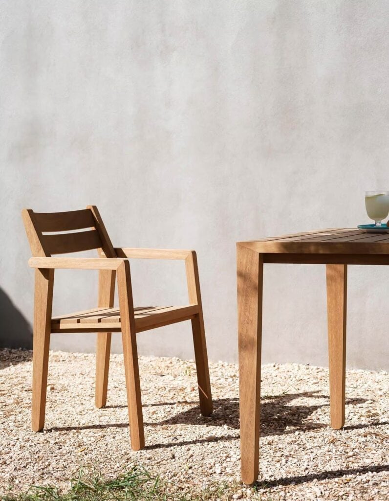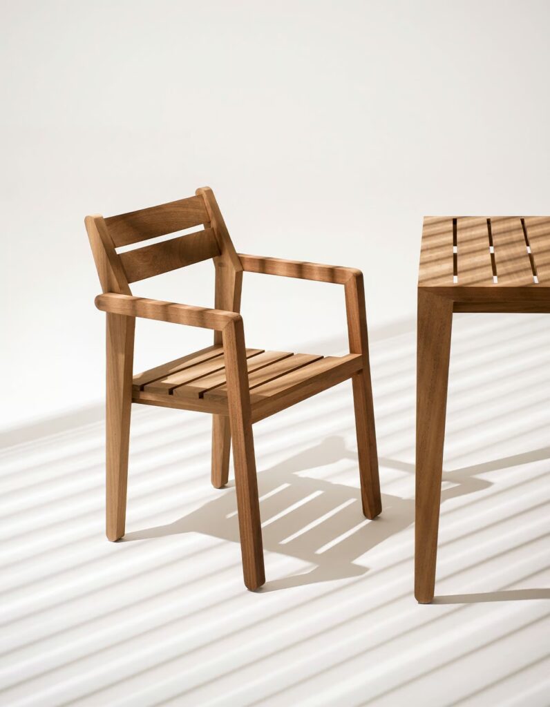 ZANIA 001 is a stackable garden chair in iroko wood (max. 4 chairs).