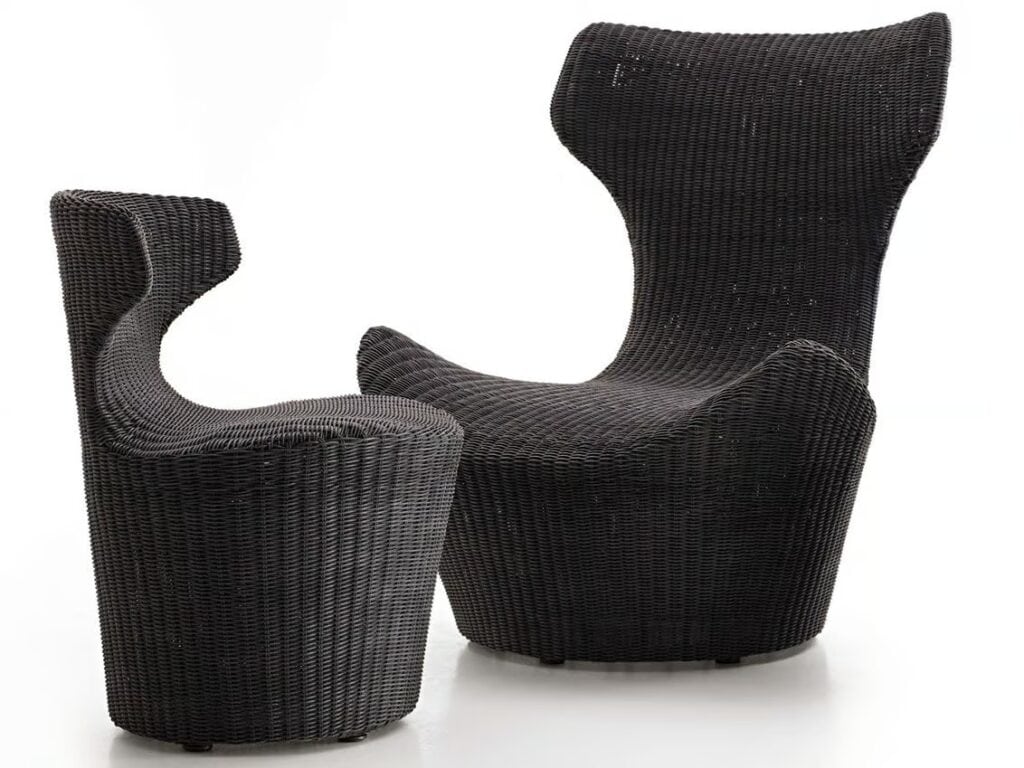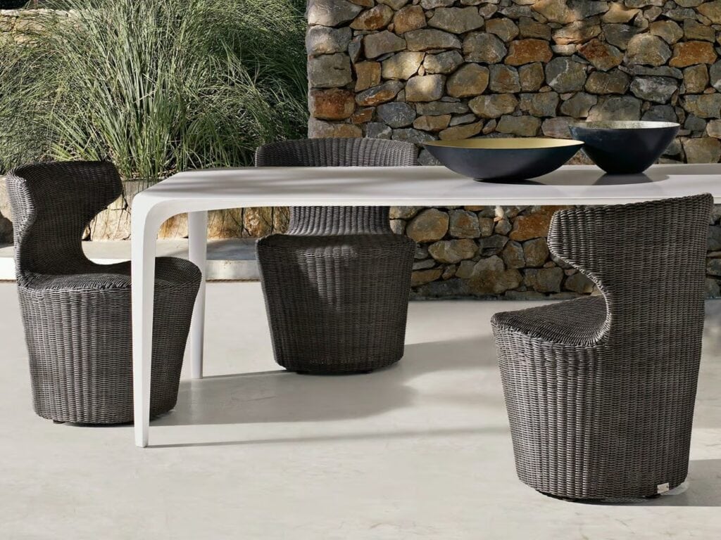 Die gleiche plastizität behaltend, wie für die indoor version, aber mit einem leichteren aussicht wegen der materialien, treten die sitze Papilio von Naoto Fukasawa in die outdoor kollektion ein. Grande papilio, piccola Papilio und mini Papilio, in allen drei grössen, stellen sich mit einem aus einem einzigen material bestehenden charakter wieder vor, das sie identifiziert, und mit einem antrazithfarbigen polyäthlengeflecht, das sich perfekt an ihre formen anpasst. Der hocker wird natürlich wie grande Papilio mit einem polyäthylengeflecht präsentiert.