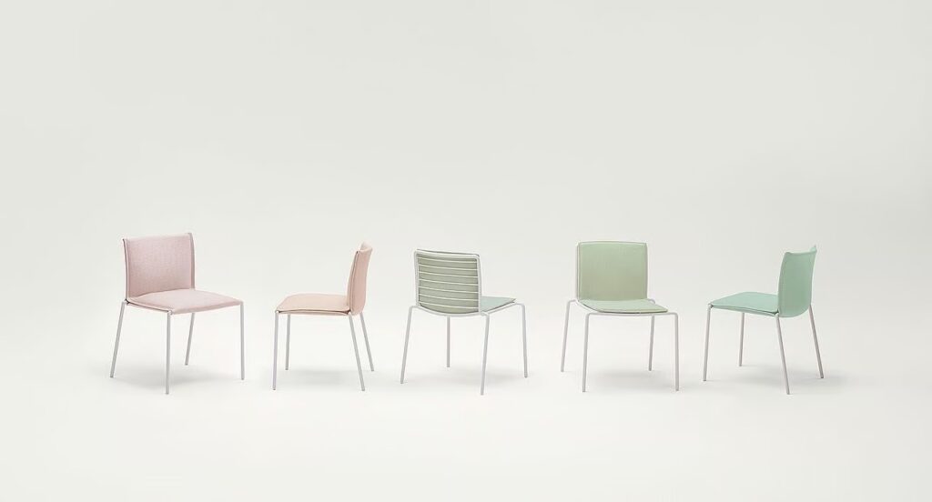 Das Sitzpolster ist in zwei Versionen erhältlich: eine einfachere, die nur die Sitzfläche bedeckt, und eine vollständigere, die auf die Stahlstruktur aufgesetzt wird und durch Reißverschlüsse, die im Polsterstoff verborgen sind, gehalten wird.