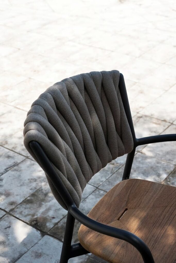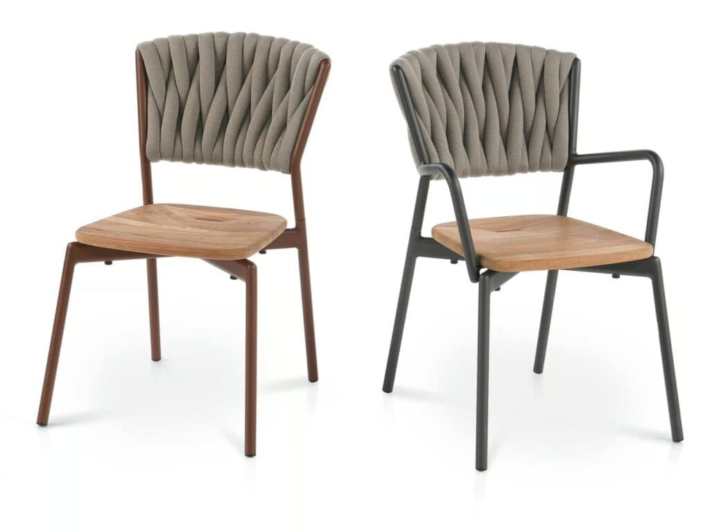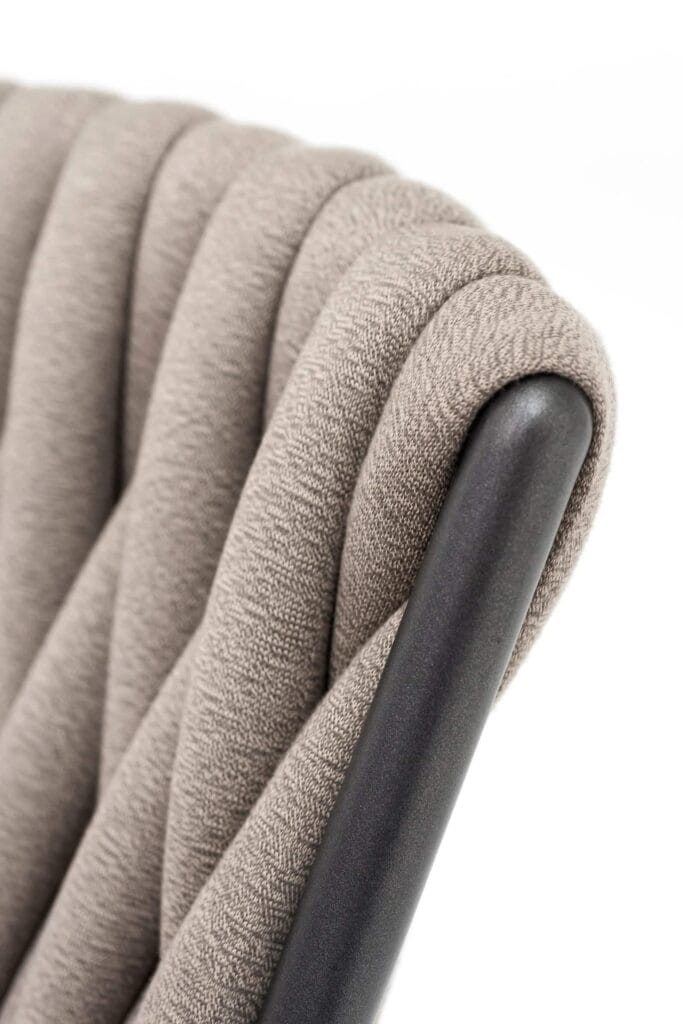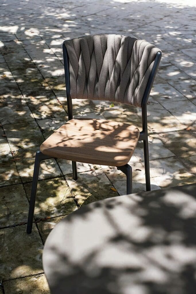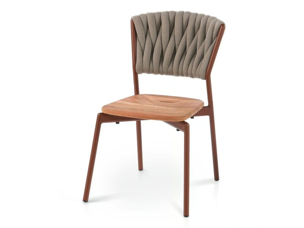 PIPER bietet eine Vielzahl an stapelbaren Outdoor Stühlen, mit und ohne Armlehnen, und Esstischstühle, die sich beim PIPER 220 Stuhl durch ein zur Verflechtung aus gepolsterten Schlauchgurten der Rückenlehnenverkleidung passendes Aluminiumrohrgestell auszeichnen. Die Kombination der Materialien kann anhand der Sitzfläche erweitert werden: weicher aus Teak oder technischer aus Polyurethanharz, Farbe Mole. Das Sitzkissen, das über einen Befestigungsdorn verfügt, der in den Schlitz Wasserablaufschlitz auf der Sitzfläche gesteckt werden kann, ist in den Outdoor Geweben der umfangreichen RODA Palette erhältlich: ein weiterer Farbtupfer für neue und unvorhersehbare Kombinationen. Durch die angebotenen Bezugvarianten eignet sich der PIPER Stuhl gut zur Kombination mit den Gartentischen aus Holz oder Metall; die Stapelfähigkeit und die einfache Pflege machen aus ihm ein Produkt, das sich für die Outdoor Bereiche von Restaurants und Hotels eignet.