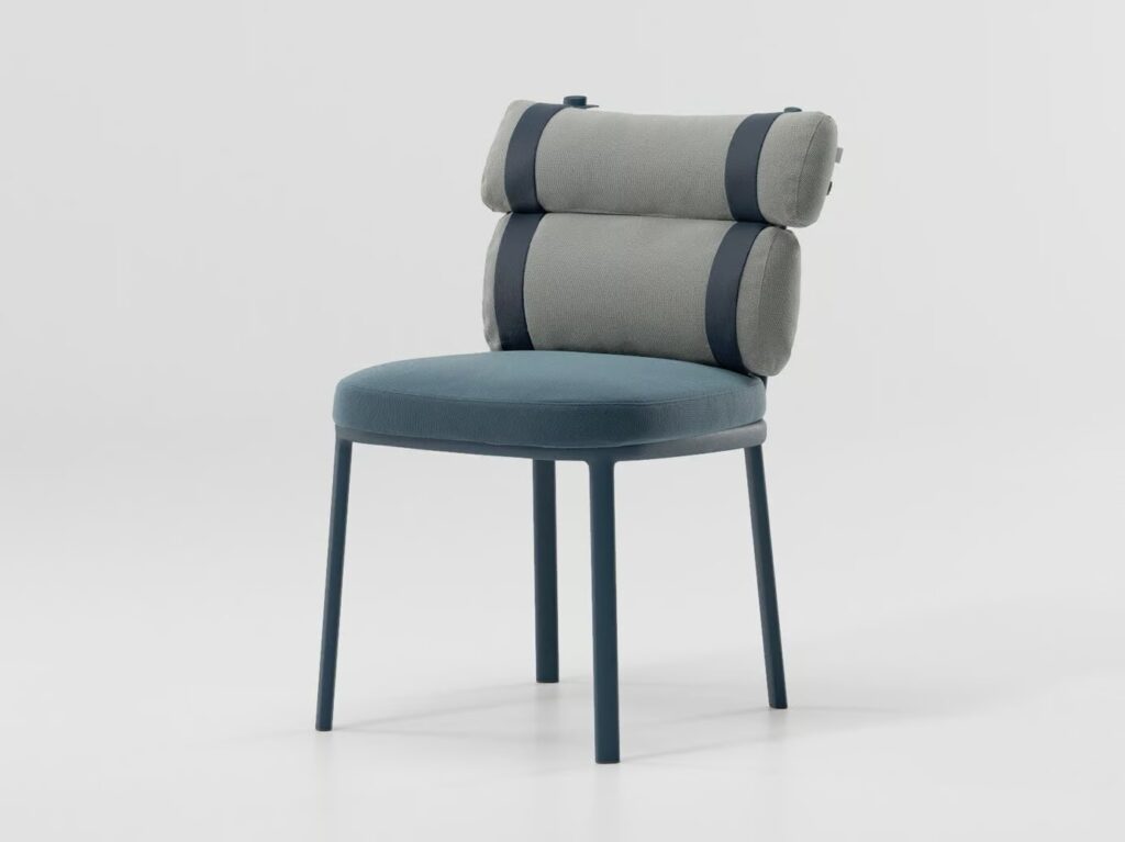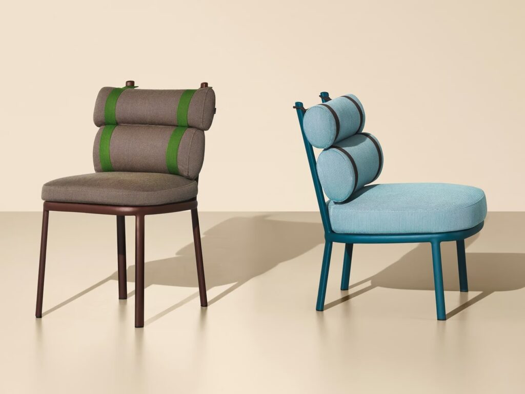 Dieses Modell interpretiert herkömmliche Polster mit einem Augenzwinkern und wartet anstelle einer normalen Rückenlehne mit zwei separaten Polsterrollen auf, die durch farbenfrohe Stoffstreifen miteinander verbunden sind.