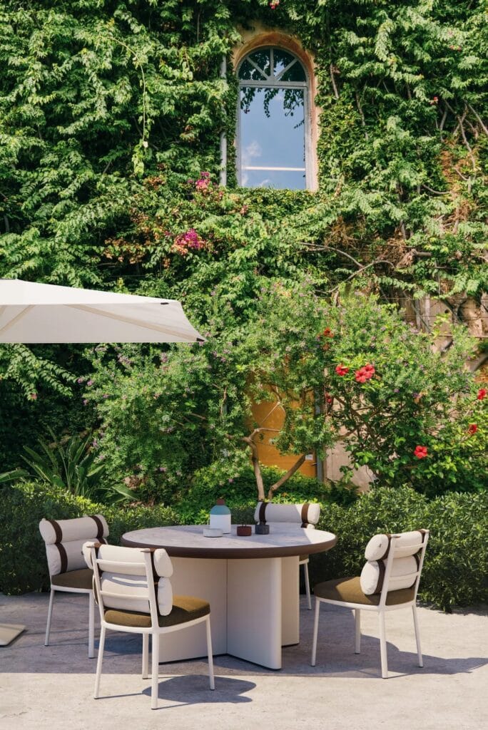 Ein schlichtes Aluminiumgestell bildet den Rahmen für die Polster, die bei diesem Stuhl die Hauptrolle spielen. Die Stoffstreifen werden mithilfe von zwei Steckern am Gestell befestigt, welche für die Aufbewahrung der Polster im Winterhalbjahr ganz einfach abgenommen werden können. Die Sitzauflage verfügt über einen Bezug aus halbtransparentem Mikrofaserstoff.