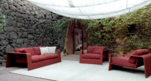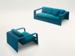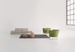 Frame ist eine Serie, die aus modularen Sofas, Podesten, Sesseln, Stühlen, Bänken und Beistelltischen besteht, die aus Aluminiumprofilen bestehen, die mit einem Twiggy-, Rope- oder Aquatech-Geflecht bespannt sind, exklusiven Garnen, die von Paola Lenti für den Einsatz im Freien entworfen und hergestellt werden. Je nach Art des verwendeten Garns kann das Geflecht einfarbig, zweifarbig oder mehrfarbig sein. Die Frame-Sitzmöbel werden durch Matratzen und zusätzliche Kissen ergänzt, die mit den exklusiven Outdoor-Stoffen der Paola Lenti Kollektion bezogen sind.
