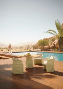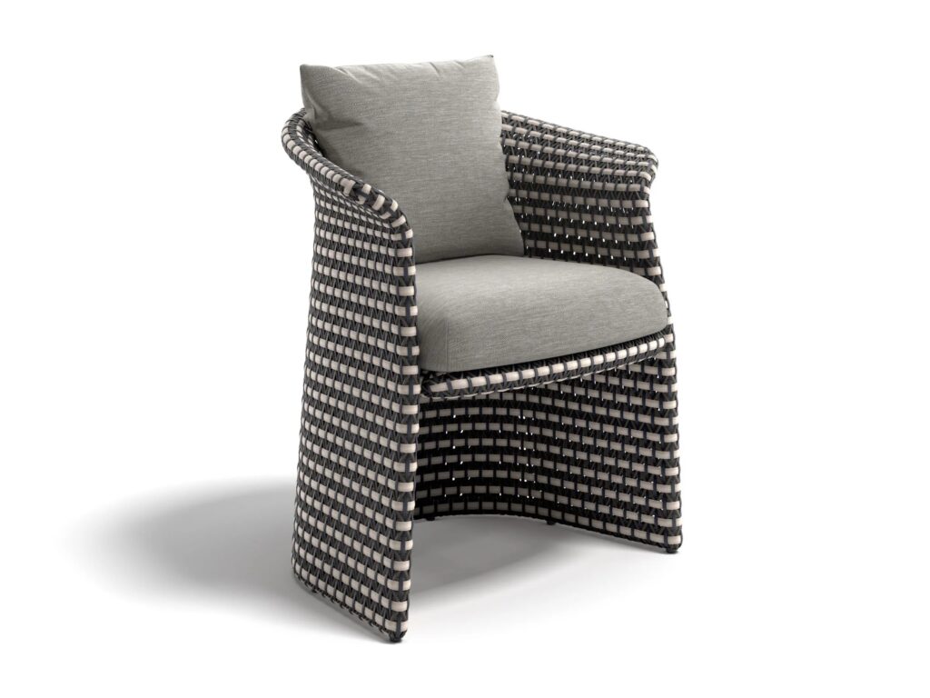 Die Meisterweber von DEDON haben mit viel Geschick ein grafisches Motiv geschaffen, das alle Kurven von FLLAIR elegant umschliesst, vom Sessel bis zum Esstisch, an dem bis zu fünf Personen bequem Platz finden, mit einer geflochtenen Basis und einer runden Teakholzplatte, die in jeder Umgebung Wärme ausstrahlt. Eine aussergewöhnlich breite horizontale Faser führt einen kontrastierenden Streifen ein, der anmutig jede Kurve durchläuft und an die natürlichen Wellen der griechischen Küstenlinie erinnert. FLLAIR ist in mehreren Farbvarianten erhältlich, die jeweils aus einer Verflechtung von drei harmonischen Schattierungen der DEDON-Faser bestehen, die der Kollektion eine einladende Wärme und einen unwiderstehlichen Charme verleihen.
