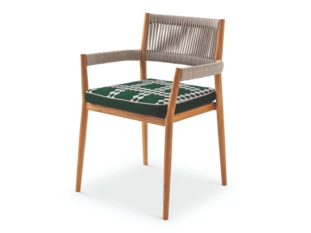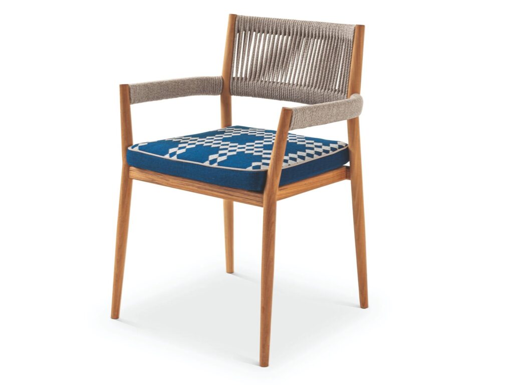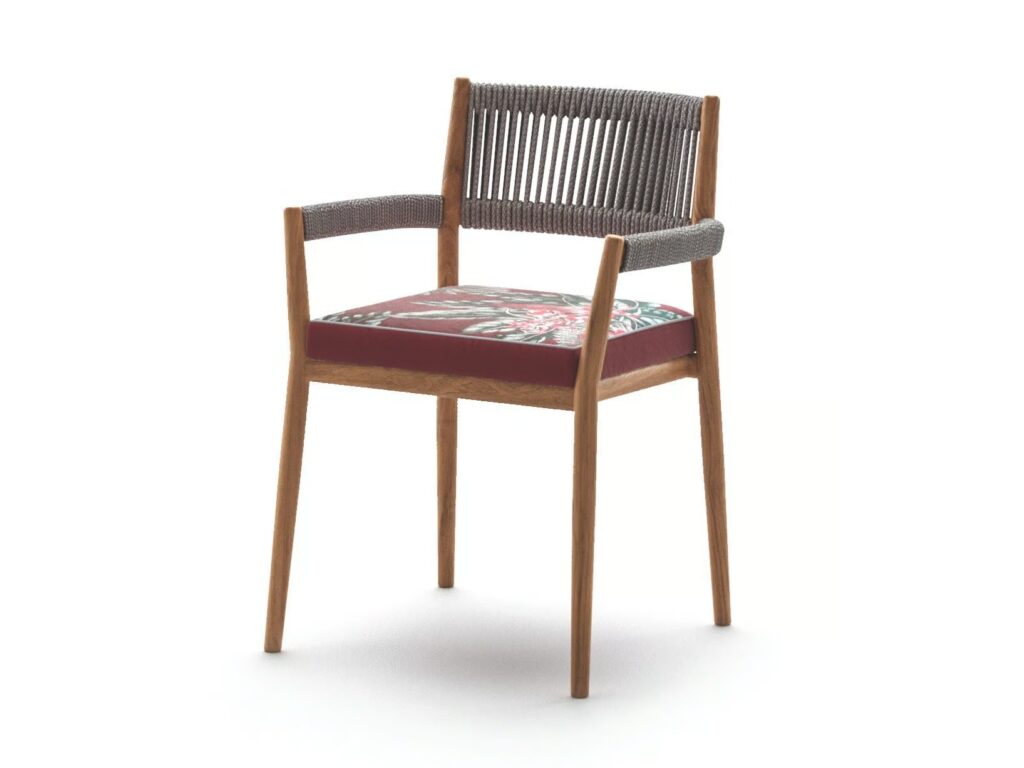 Die Produktfamilie Dine Out ist zur Bereicherung des Essbereichs im Freien im Zeichen des Komforts, der Gemeinsamkeit und des edlen Stils gedacht. Der stapelbare Stuhl mit Armlehnen, der mit den skulpturenhaften Formen des Esstischs kombiniert wird, weist eine Struktur aus massivem Teakholz auf, die durch eine graue, von Hand geflochtene Polypropylenkordel rund um die Armlehnen und den oberen Teil der Rückenlehne bereichert wird. Die Sitzfläche ist besonders bequem, da sie aus einem Wattekissen mit Einsatz aus Polyurethanschaum besteht, das mit wasserabweisendem Stoff bezogen ist. Es ist mit zwei Bändern auf den Latten aus massivem Teakholz befestigt, wodurch der Holzrahmen frei sichtbar belassen wird. Der Stuhlwird überdies durch eine Einfassung aus grauem Ripsband am oberen Rand verziert. Vervollständigt wird die Kollektion durch einen Tisch in drei Grössen.