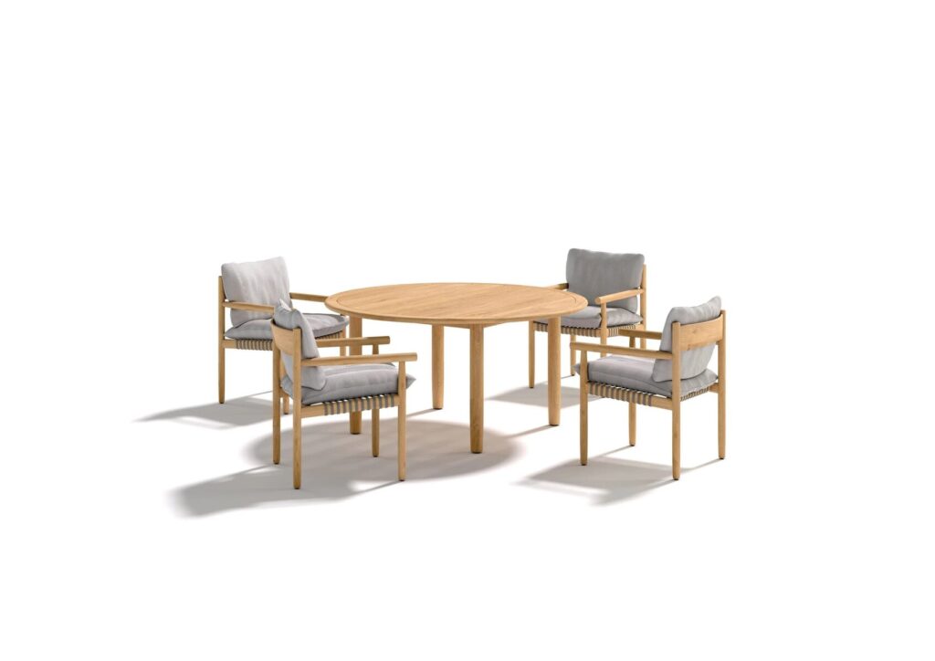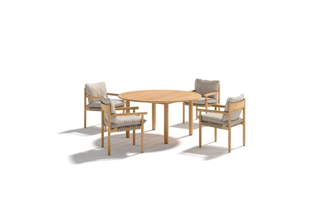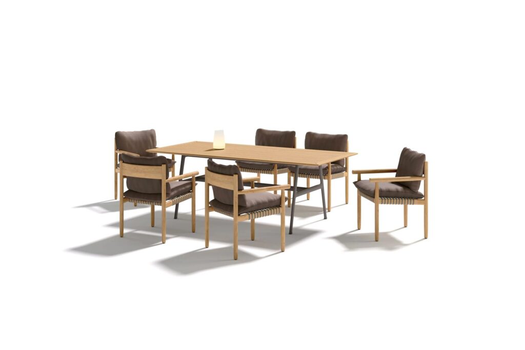 Die renommierten britischen Designer Edward Barber und Jay Osgerby entwarfen TIBBO für eine Zeit, in der Innen- und Aussenbereiche immer mehr miteinander verschmelzen. TIBBO ist die erste Teakholz-Kollektion von DEDON und vereint sorgfältige Handwerkskunst, überragenden Komfort und bemerkenswerte Leichtigkeit in einem Design, das unverwechselbar, elegant und rein ist. TIBBO besteht aus Ess- und Loungeelementen aus Teakholz, Textilien und gewebten Fasern und vermittelt ein aussergewöhnlich reiches und luxuriöses Aussehen und Gefühl. TIBBO zeichnet sich durch eine gewisse architektonische Strenge aus, sowohl in der Konstruktion als auch in den Proportionen. Die Rationalität des Designs wird jedoch durch die Wärme des Holzes, den Komfort der Kissen, das natürliche Aussehen der speziell entwickelten Faser und die segelartige dreidimensionale Kurve der geformten Rückenlehnen ausgeglichen. Die Kollektion wird in Handarbeit aus hochwertigem Teakholz gefertigt, das aus nachhaltigen Plantagen stammt. Hochwertiges Teakholz bietet eine hohe Witterungsbeständigkeit und Haltbarkeit auch unter extremen Bedingungen. In Innenräumen behält TIBBO seinen goldenen Farbton. Im Freien, wenn es unbehandelt bleibt, erhält es auf natürliche Weise eine silbergraue Patina, die, so die Designer, „dem Design eine weitere Ebene der Qualität verleiht“.