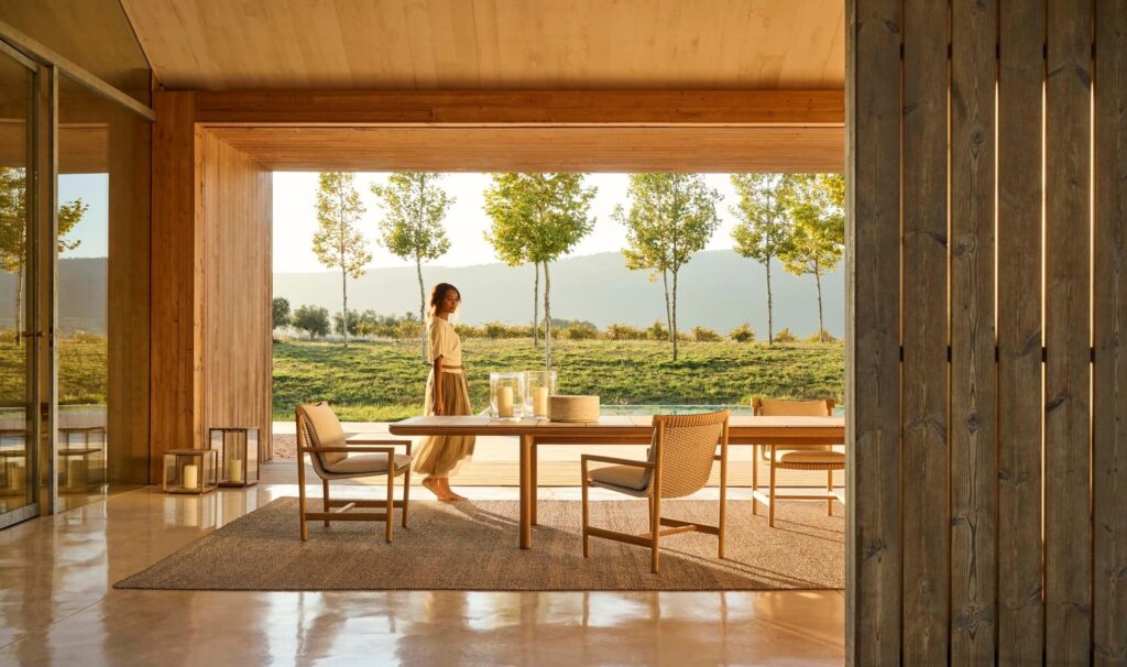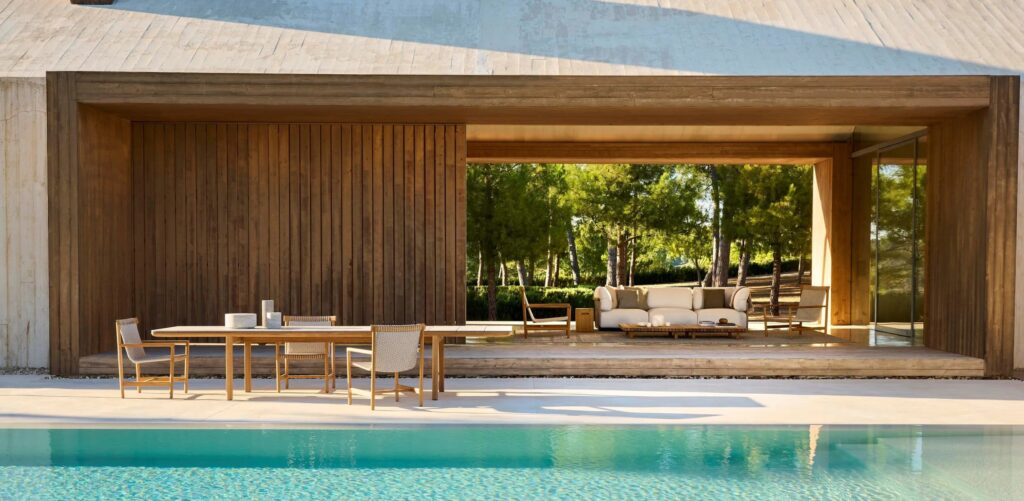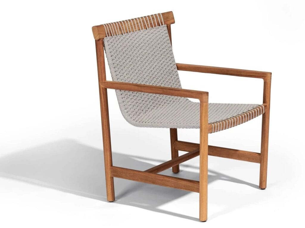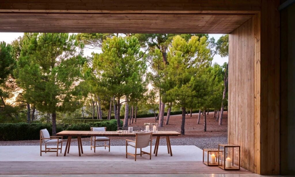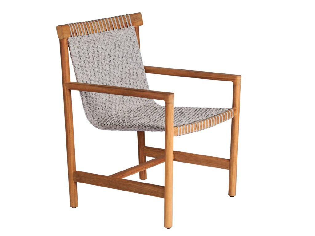 Die Armlehnstuhl und Lounge Sessel verfügen über geflochtene Canax®-Schlingensitze aus Hanf, die in das schlichte Teakholzgestell eingespannt sind und so die Illusion eines schwebenden Stuhls vermitteln. Die breiten Keramikfliesen des Tisches scheinen auf dem diskreten, aber robusten Teakholzrahmen zu schweben und schaffen eine bemerkenswerte Leichtigkeit. Die abgerundeten Kanten der Teakholzprofile und der äußeren Keramikfliesen vermitteln ein weiches und harmonisches Aussehen.