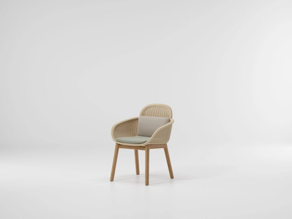 Der Stuhl besteht aus einem Korb mit großen Rückenlehnenpolstern. Von der Seite und von hinten betrachtet hat er ein modernistisches Aussehen. Das Geflecht ist traditionell, eine klassische Outdoor-Faser.