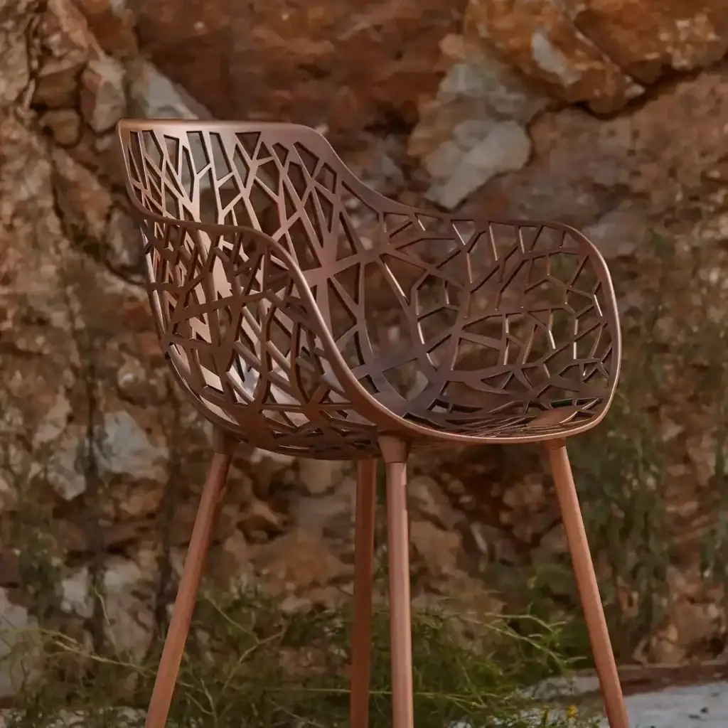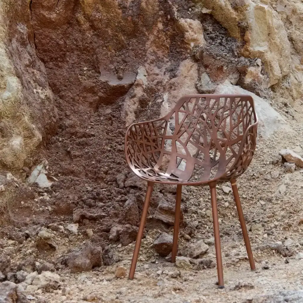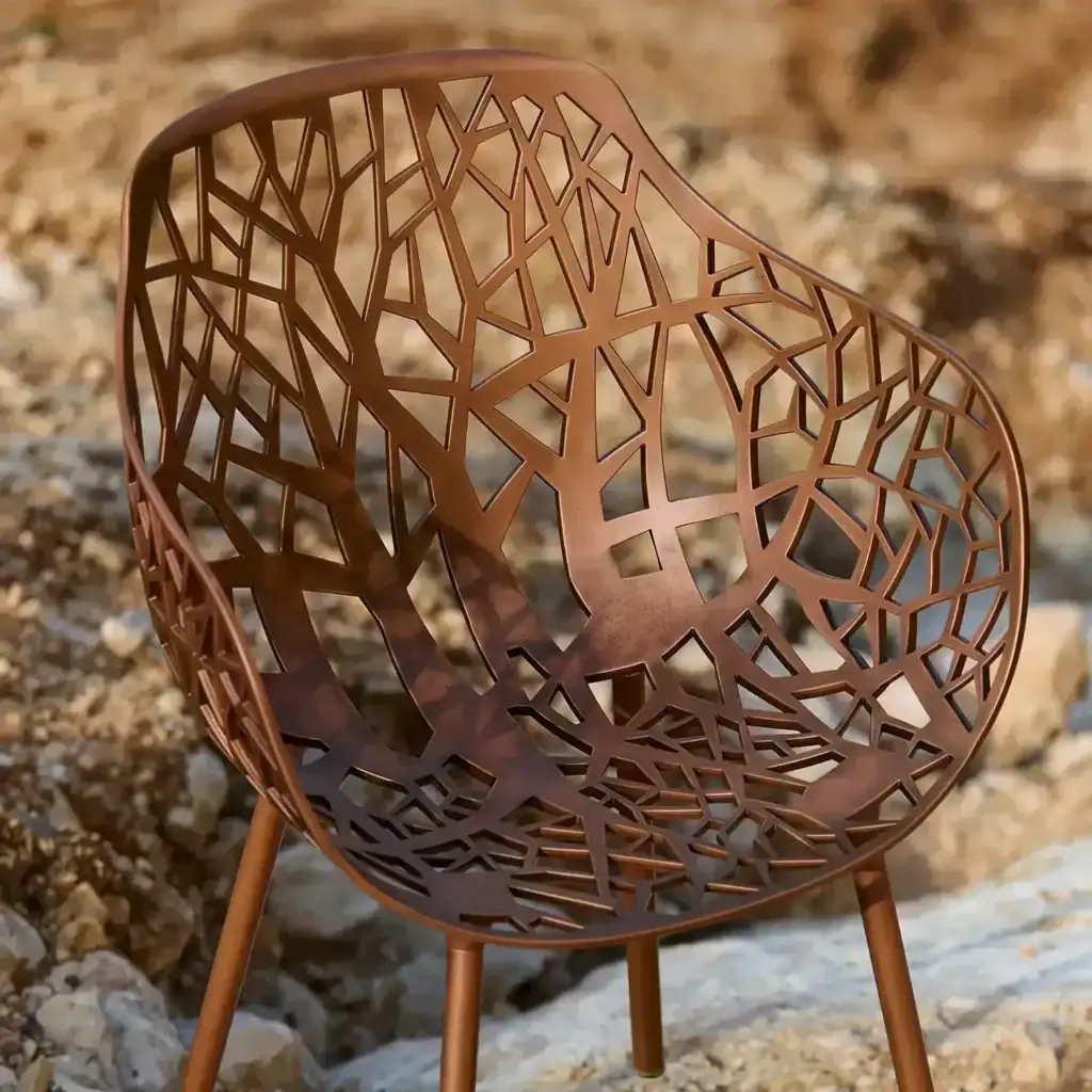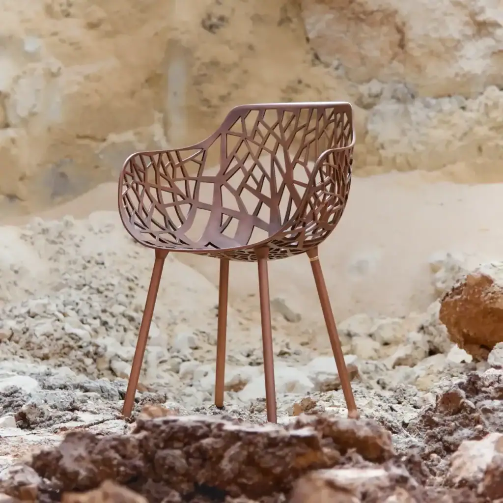 Der FOREST Stuhl kombiniert nachhaltige Materialien mit charakterstarker Ästhetik: ein organisches Erscheinungsbild, das sowohl in natürlichen wie urbanen Aussenräumen wirkt. Die Gestaltung ist inspiriert von Formen und Strukturen der Natur und übersetzt diese in eine zeitlose, ruhige Präsenz — ideal für Terrassen, Gärten oder Lounge-Zonen, wo Design und Langlebigkeit gefragt sind.