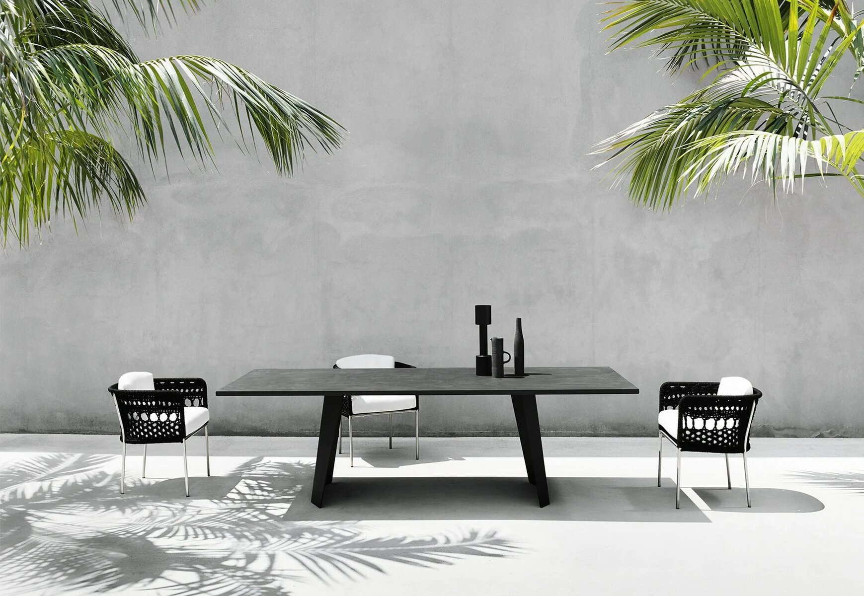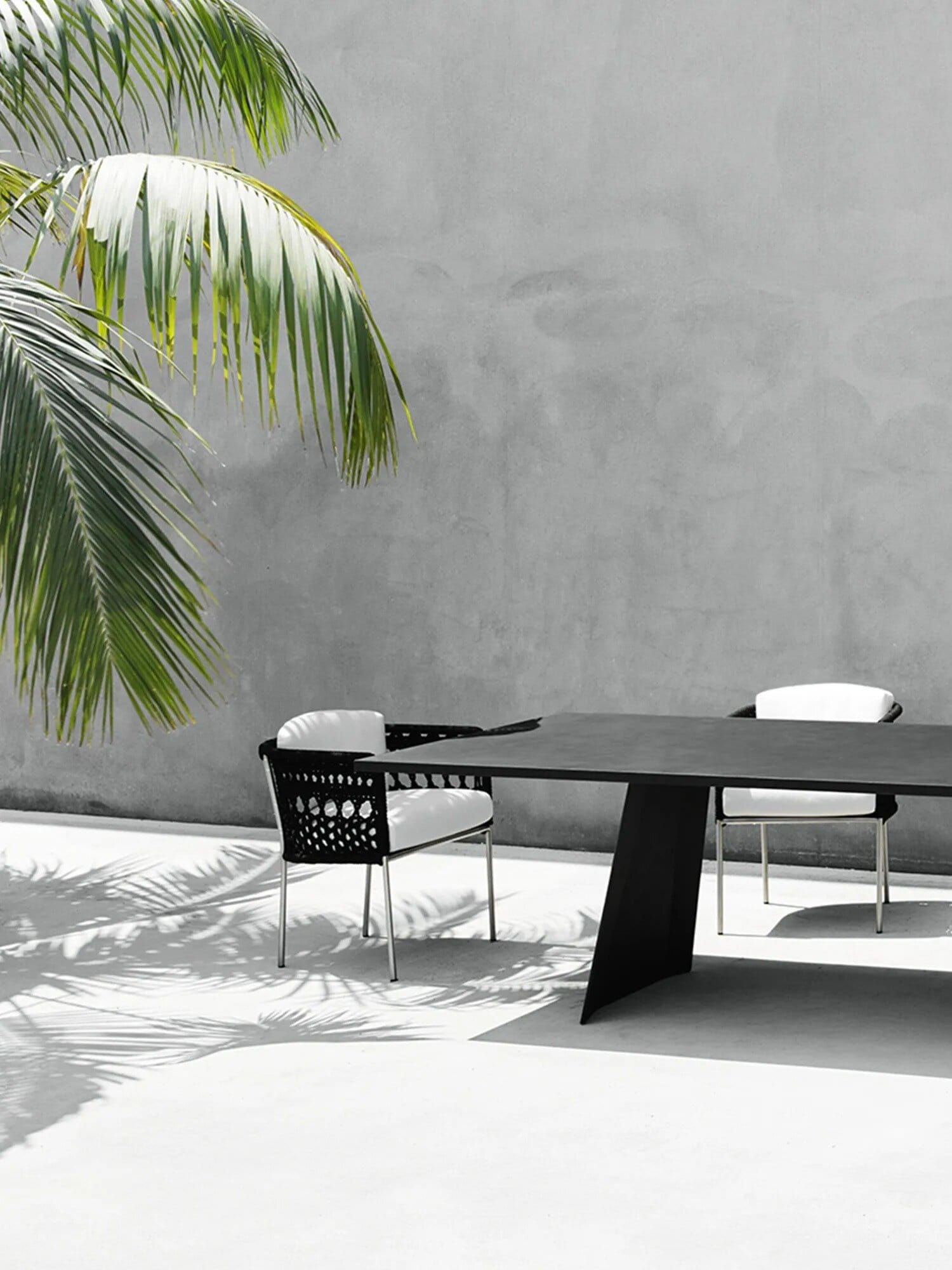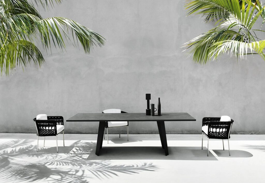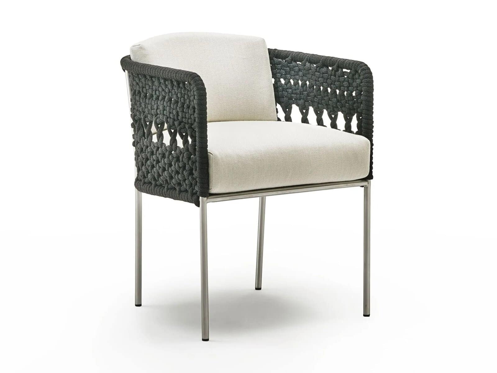 Outdoor-Version: Stahlrohrrahmen aus Edelstahl AISI 316 mit matter Satinierung oder Edelstahl AISI 316 mit Epoxid-Pulverbeschichtung in Rotgussgrau. Sitzplatte aus selbsttragendem, dekorativem HPL-Kunststofflaminat. Sitz- und Rückenkissen gepolstert mit offenzelligem Polyurethanschaum DRYFEEL S und mit Faserbezug für Outdoor, beschichtet mit wasserdichtem Stoffschutz. Polsterung nur mit Outdoor-Stoffen, vollständig abnehmbar durch Reissverschlüsse. Beide Versionen sind mit einem hypoallergenen, recycelbaren, umweltfreundlichen Schlauch gewebt, der sowohl für den Innen- als auch für den Aussenbereich geeignet ist, in den Farben der Kollektion.