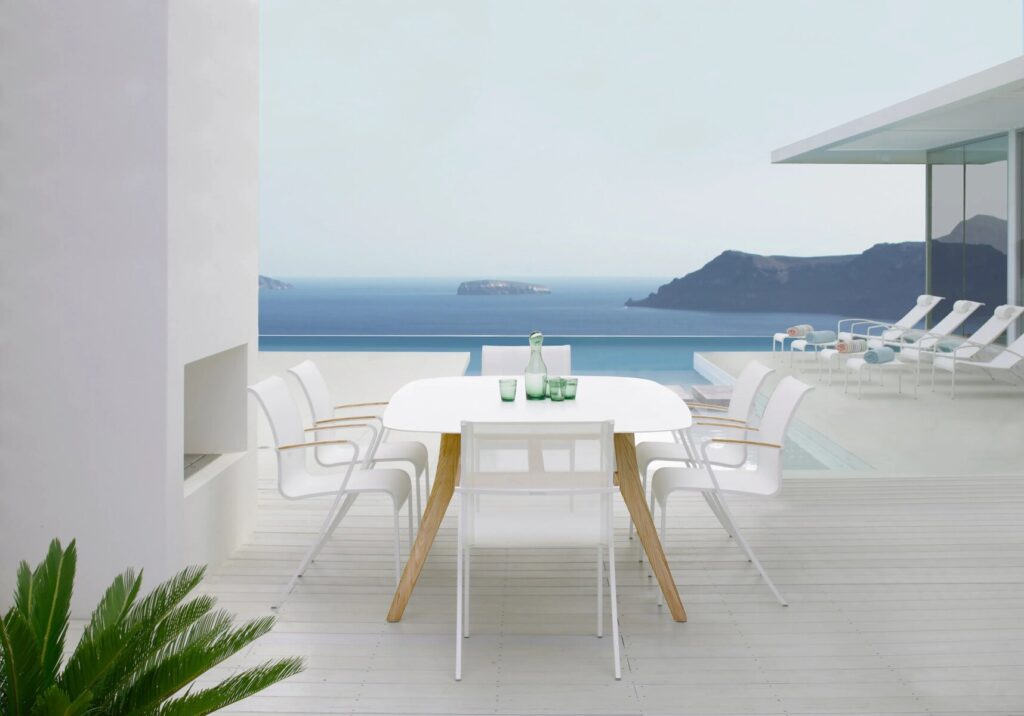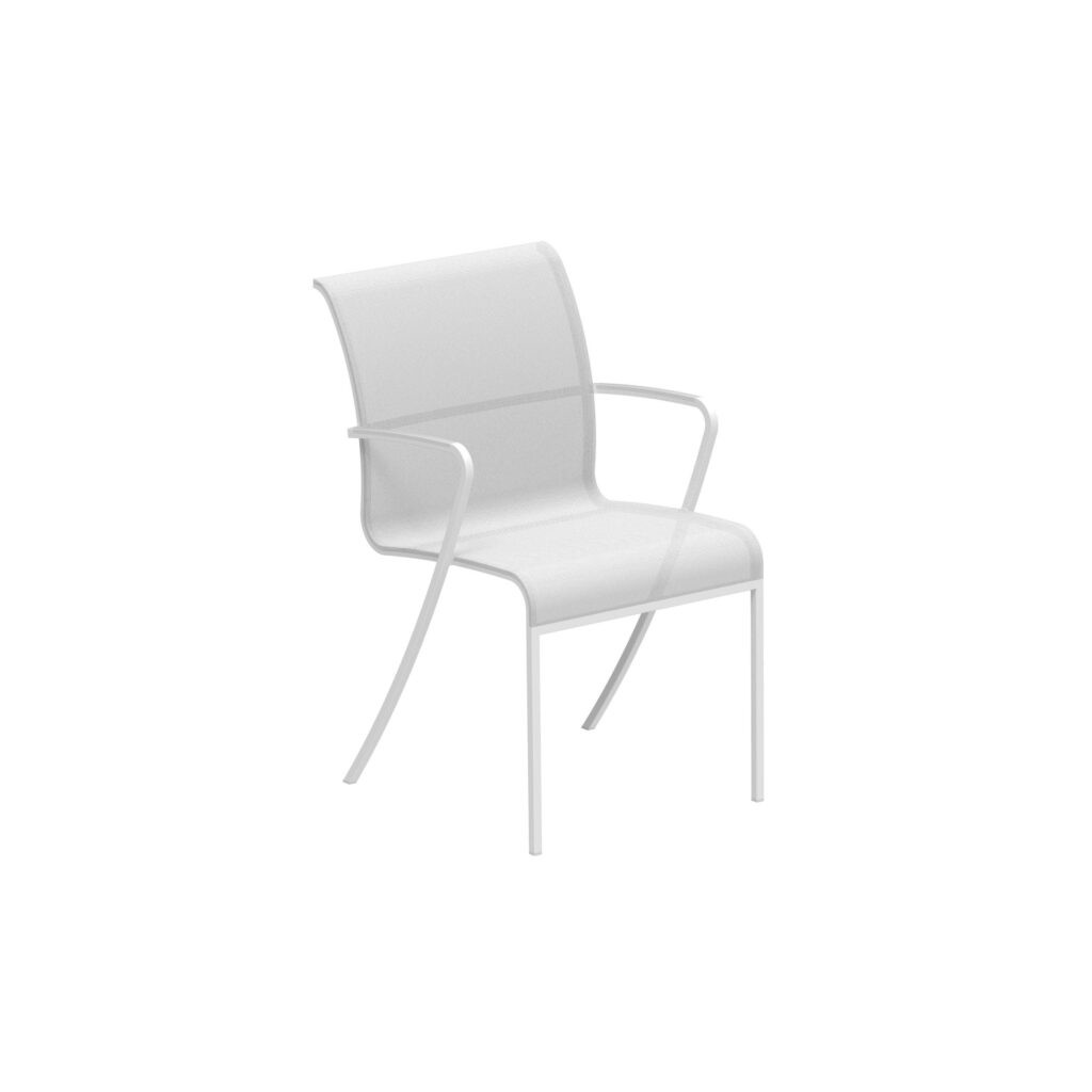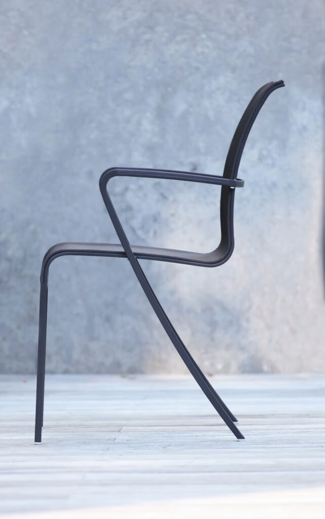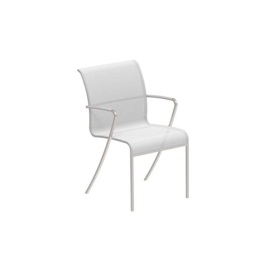 QT ist ein stapelbarer Stuhl mit Armlehnen. Er hat eine Struktur aus Edelstahl und Batyline®. Optionale Armlehnen aus Teakholz.