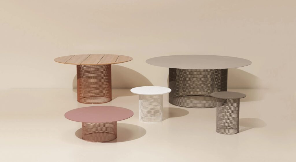 Diese Kollektion mit Gitterflächen erinnert an Gebäudefassaden, die die Umgebung filtern und trotzdem licht- und luftdurchlässig sind. Industrielle und natürliche Materialien, harte und weiche Oberflächen sowie transparente und massive Elemente wurden beim Entwurf dieser Outdoor-Möbel kombiniert, die mit spannenden Kontrasten aufwarten. Das bei den Tischen und Rückenlehnen der Sofas verwendete Streckmetall sorgt für eine gewisse Leichtigkeit und dient gleichzeitig als Unterbau für Tischplatten aus Holz und Marmor bzw. diverse Sofakissen. Die sanfte Rundung der Sofaseiten verleiht dem industriell anmutenden Rahmen eine gewisse Zartheit und lädt zu einem erholsamen Mittagsschlaf ein.