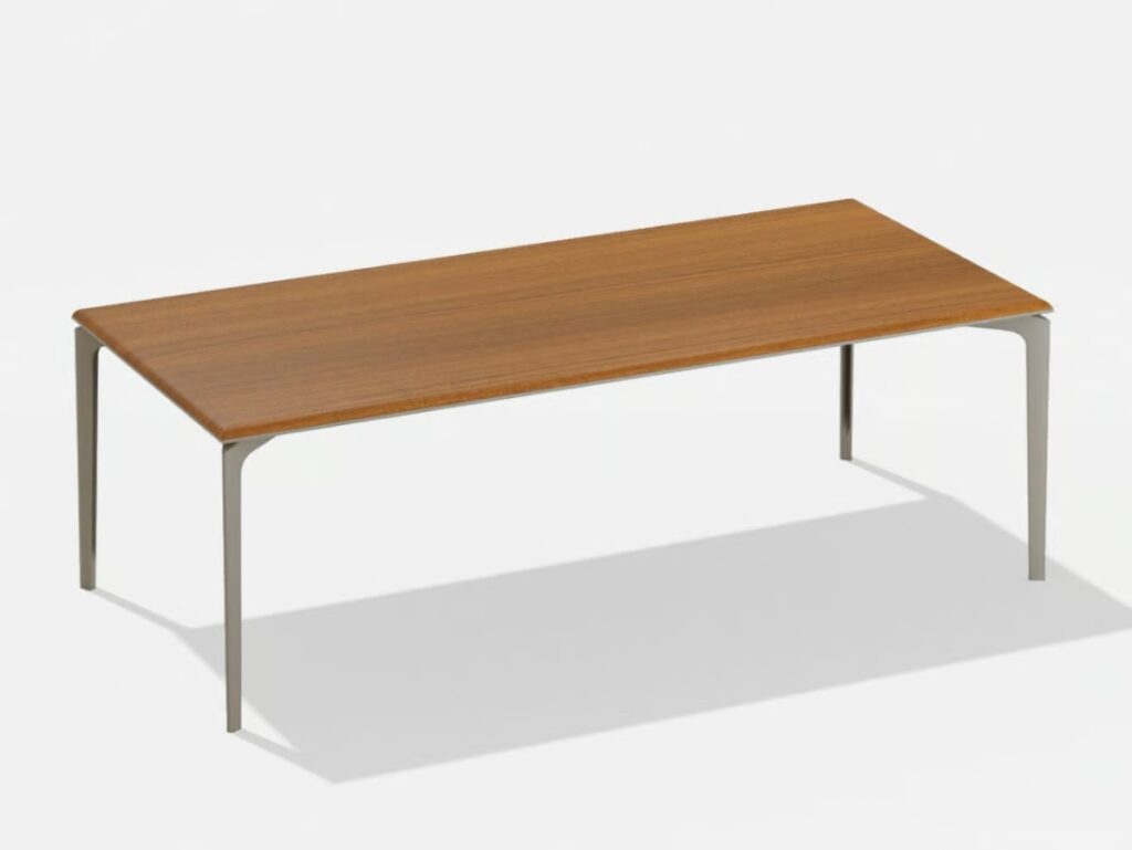 AllSize ist ein rechteckiger Tisch mit Holzplatte und Aluminiumstruktur. Ein originelles Gewand, wärmer und taktiler, mildert die geometrische Strenge von AllSize. Die Tischkollektion FAST, die individuell gestaltet werden kann, wurde um eine neue Variante mit Iroko-Platte ergänzt, die zu den Platten aus Aluminium, gesprenkeltem Aluminium und Steinzeug hinzukommt. Iroko ist ein afrikanisches Holz mit einer charakteristischen gelb-braunen Farbe, das sich besonders für den Aussenbereich eignet. FAST hat es durch eine Behandlung mit wasserabweisenden Ölen noch widerstandsfähiger gegen Witterungseinflüsse gemacht. Die abgerundete Kante verstärkt den harmonischen Stil der Linie dieses Tisches und schafft einen angenehmen visuellen Effekt der Kontinuität zwischen der Platte und den Beinen.