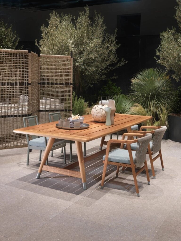 DESCO - Der Ursprung des Begriffs "Desco" geht nicht alleine auf den Tisch zurück, der als Gegenstand verstanden wird, an den man sich zum Essen setzt, sondern auch auf den Brauch, die Gastlichkeit durch Speisen zu zelebrieren, der Teil der italienischen Kultur ist. Es gibt wenig, was uns glücklicher macht, als ein reich gedeckter Tisch und das gemeinsame Speisen zusammen mit der Familie und mit Freunden. Die minimalistischen Formen des Tischs Desco Outdoor, die direkt auf den Archetypen des Gebrauchsgegenstands Tisch zurückgehen, stehen für Werte wie Stabilität, Tradition und Zweckmäßigkeit. Das Gestell des Tischs besteht aus massivem Iroko-Holz und kann mit Tischplatten mit Holzlatten kombiniert werden, wenn ein elegantes einfarbiges Design gewünscht wird, oder alternativ dazu aus Naturstein vom Typ Beola Argentata, Porphyr, Lavastein oder Pietra del Cardoso. Ein charakteristisches Detail des Tischs ist der untere Abschluss der Tischbeine, die mit Aluminiumfüßen mit Nylongleitern ausgeführt sind. Die Tische und Beistelltische der Familie Desco Outdoor sind in einer breiten Auswahl an Oberflächen, Formen und Größen erhältlich und eignen sich für die Einrichtung von Dining- und Loungebereichen im Freien in den unterschiedlichsten Umgebungen. Wenn der Tisch Desco Outdoor für längere Zeit nicht verwendet wird, wird empfohlen, ihn mit der entsprechenden Schutzhülle abzudecken, damit er sich seinen guten Zustand und sein ursprüngliches Aussehen langfristig bewahrt. Alle Teile, aus denen der Tisch Desco Outdoor gefertigt wird, sind recycelbar.