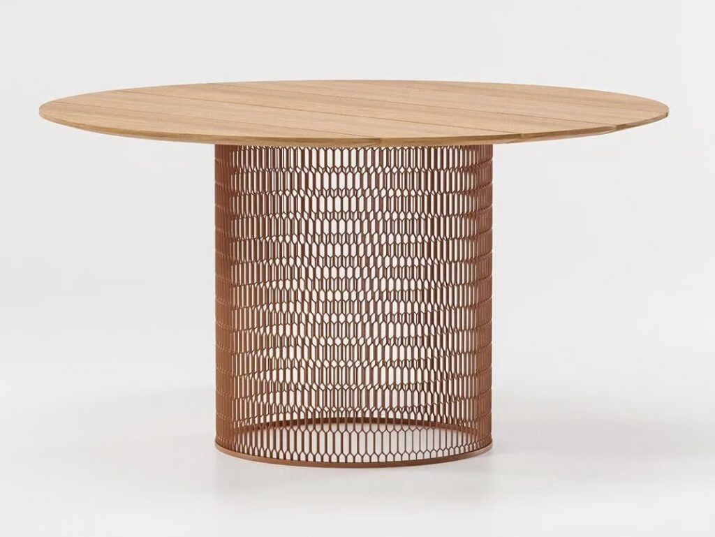 Diese Kollektion mit Gitterflächen erinnert an Gebäudefassaden, die die Umgebung filtern und trotzdem licht- und luftdurchlässig sind. Industrielle und natürliche Materialien, harte und weiche Oberflächen sowie transparente und massive Elemente wurden beim Entwurf dieser Outdoor-Möbel kombiniert, die mit spannenden Kontrasten aufwarten. Das bei den Tischen und Rückenlehnen der Sofas verwendete Streckmetall sorgt für eine gewisse Leichtigkeit und dient gleichzeitig als Unterbau für Tischplatten aus Holz und Marmor bzw. diverse Sofakissen. Die sanfte Rundung der Sofaseiten verleiht dem industriell anmutenden Rahmen eine gewisse Zartheit und lädt zu einem erholsamen Mittagsschlaf ein.