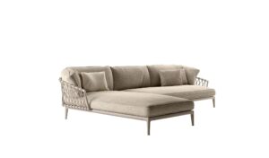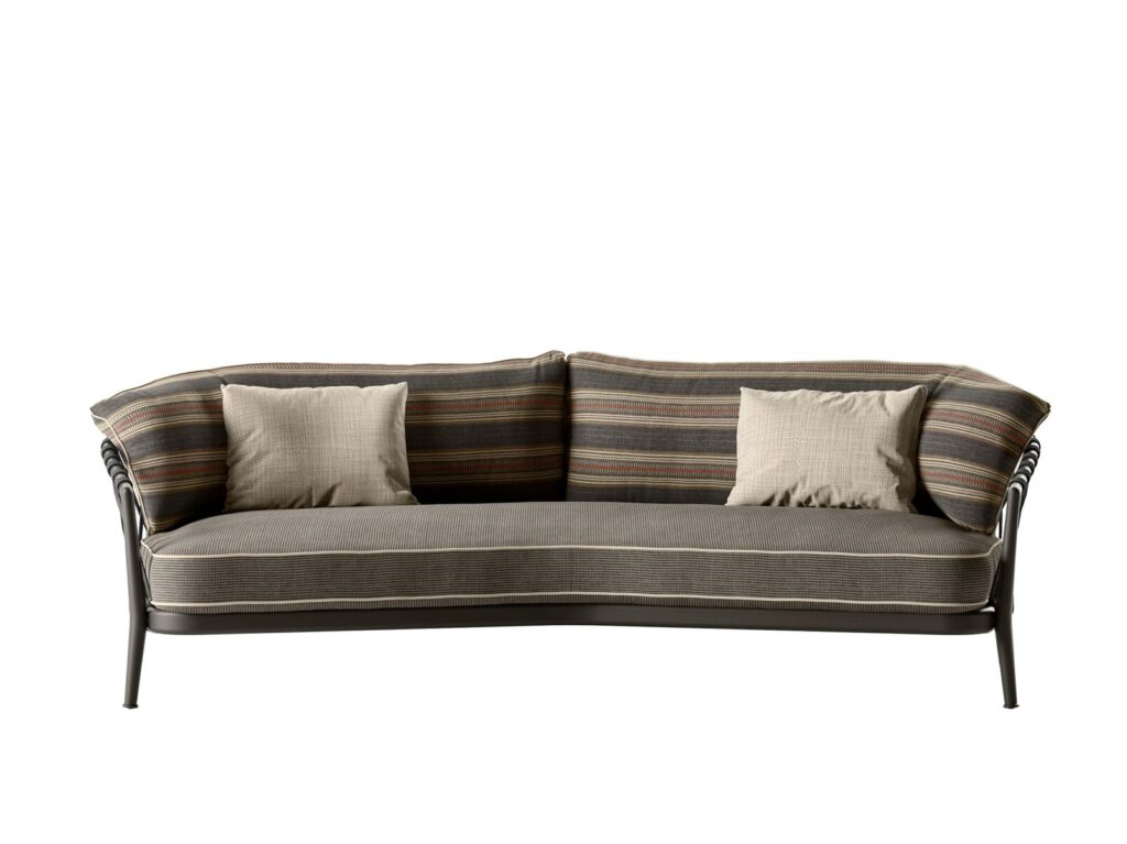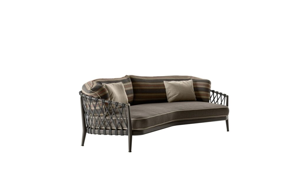 Die Sofas der Serie Erica für den Außenbereich zeichnen sich durch ihre Leichtigkeit und ihr raffiniertes Design aus, die ihre Verwendung sowohl in öffentlichen als auch in privaten Räumen nahelegen, wobei die Kriterien der Ergonomie und der Anpassungsfähigkeit an die Umwelt beachtet werden. Das Angebot umfasst Sofas in geradliniger Ausführung in verschiedenen Größen mit mehr oder weniger tiefer Sitzfläche, Sofas mit leicht geschwungenem Design, die ideal sind, um dynamische und gesellige Lösungen für die Entspannung im Freien zu schaffen, eine Dormeuse, die sich ebenfalls durch ihr geschwungenes Design auszeichnet, und ein Tagesbett mit besonders großzügigen Proportionen, das mit einer hohen Rückenlehne und integrierter Kopfstütze ausgestattet ist. Gemeinsame Elemente der Serie sind die Strukturen aus pulverbeschichtetem Aluminiumdruckguss, die sich durch Leichtigkeit und Langlebigkeit auszeichnen, das für den Außenbereich konzipierte Bandgeflecht aus Polypropylen und das Fußdesign, das ein Gefühl der visuellen und formalen Kontinuität vermittelt. Die mit einem dekorativen Profil versehenen Sitzkissen laden dank der Polsterung, die den Eindruck natürlicher Weichheit vermittelt, zum Entspannen ein. Die Strukturen und Geflechte sind in raffinierten Farbtönen gehalten, die sich mit einer breiten Palette von Bezügen in zahlreichen Farbtönen und Mustern kombinieren lassen.