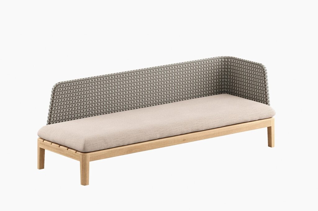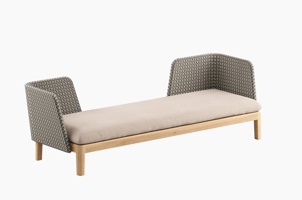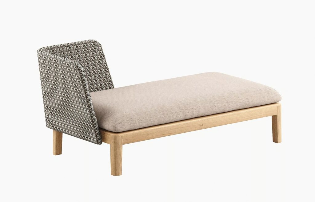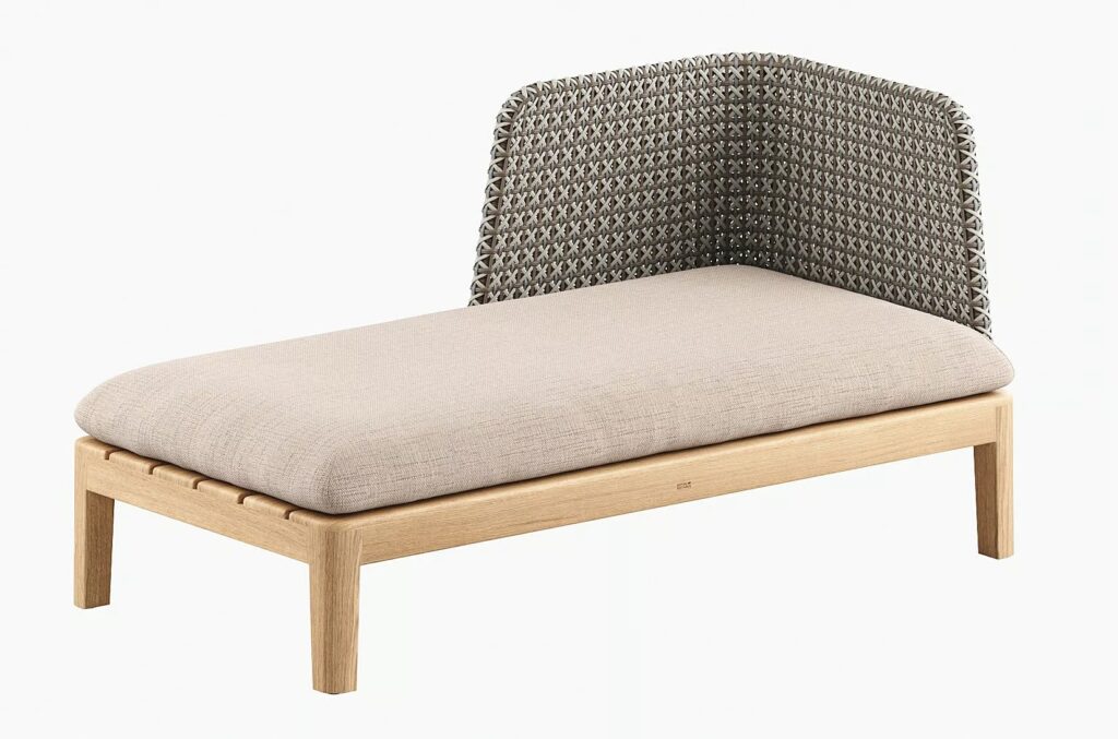 Calypso Lounge ist eine gepolsterte Gartenliege aus Kunststoff und Teakholz.