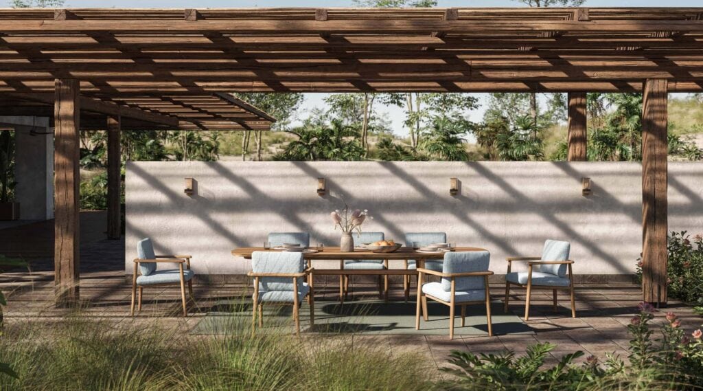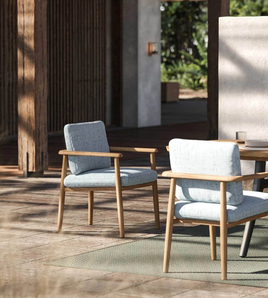 Mambo ist ein Gartenstuhl mit Holzgestell und Polsterung mit Stoffbezug.