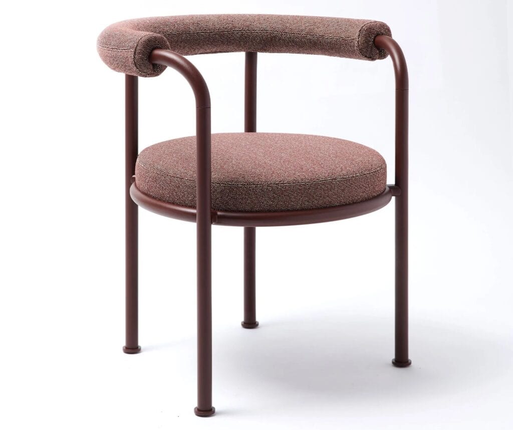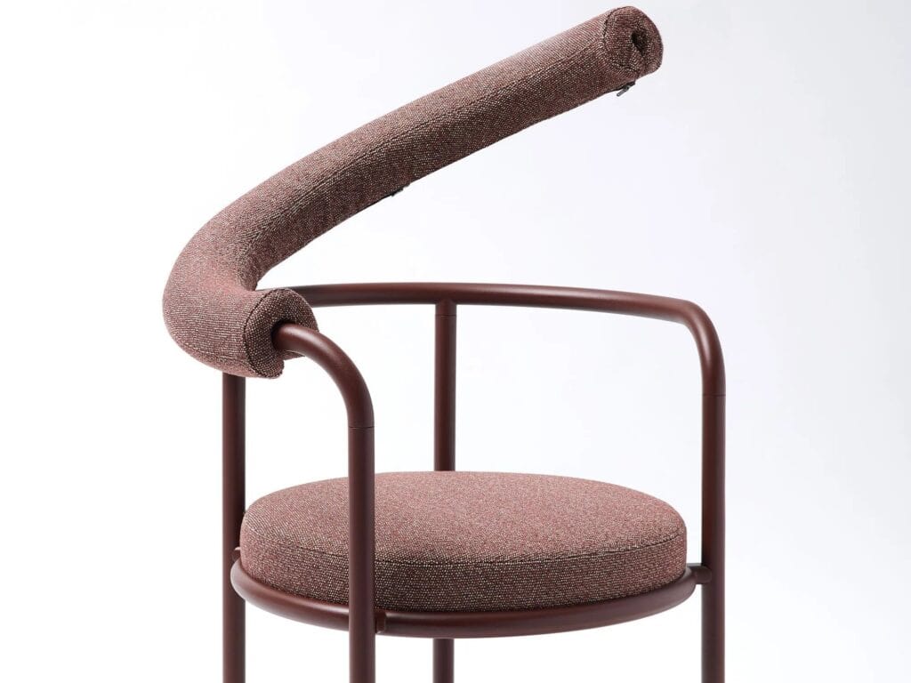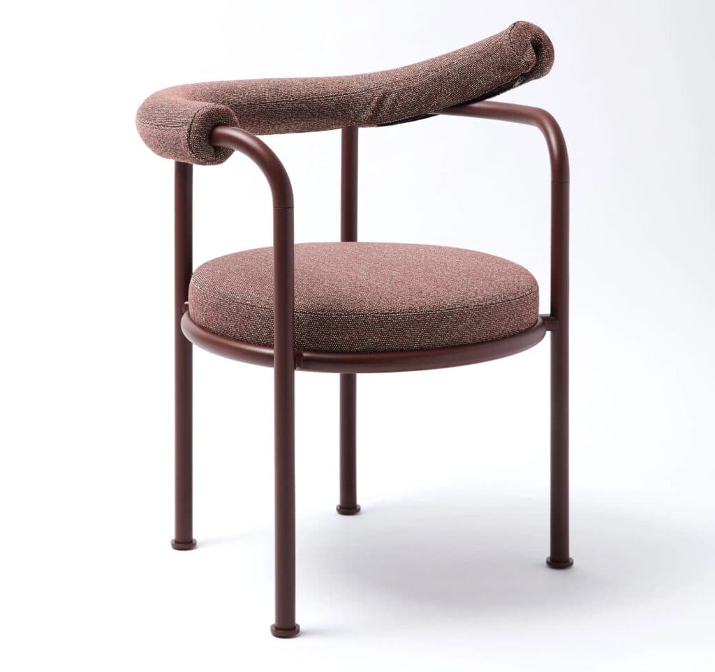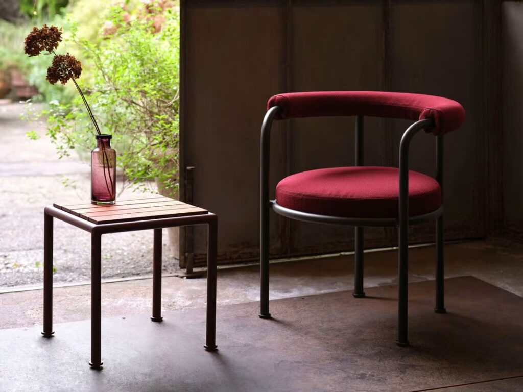 Roè is a garden armchair with upholstored seat and backrest made of powder-coated aluminum.