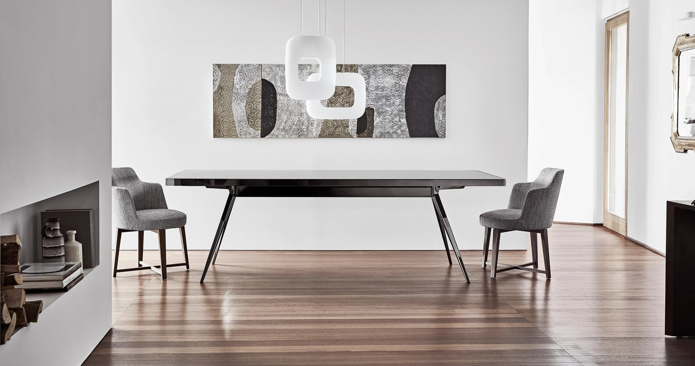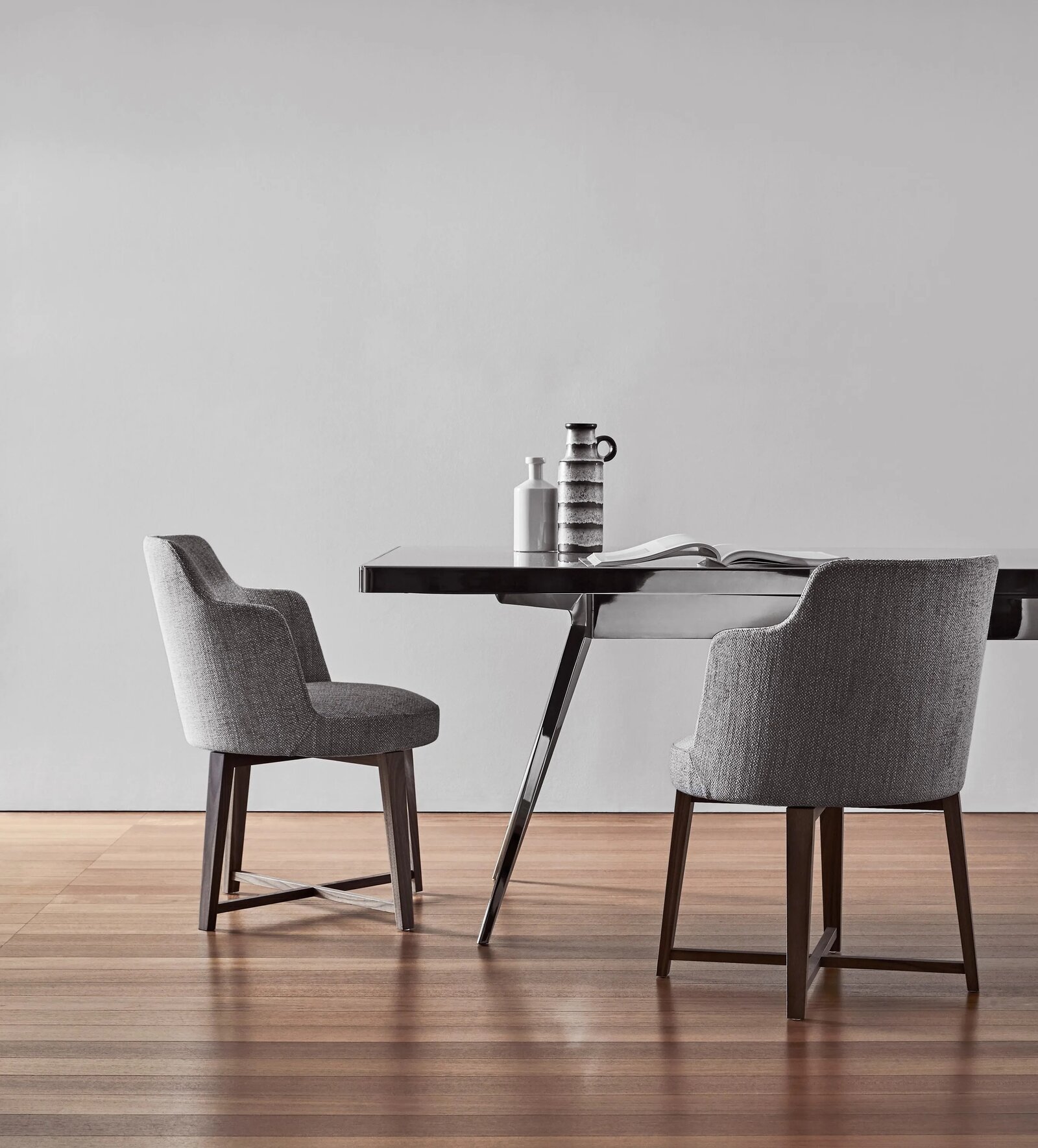 Hera ist eine Familie mit Armsesseln und Stühlen, die eine gelungene Synthese von Ergonomie und Eleganz verkörpern und eigens sowohl für die Verwendung in Wohnbereichen als auch im Gastgewerbe konzipiert wurden, wie Lounge-Bereiche, Wartebereiche und Restaurants. Mit einer Sitzschale, die aus einem Spezialpolymer gefertigt ist und hohen Sitzkomfort garantiert, ist das Gestell der Armsessel und Stühle angenehm leicht. Die Armsessel und Stühle Hera sind komplett abziehbar und in zwei Ausführungen erhältlich, und zwar mit schlanken Beinen aus Aluminiumdruckguss mit den Oberflächen satiniert, verchromt, brüniert und verchromt in den Farben Schwarz oder Champagner, oder mit Beinen aus massivem Amerikanischen Nussbaum oder Esche in verschiedenen Farbnuancen.