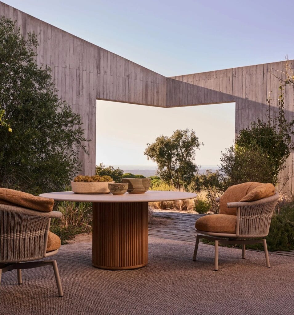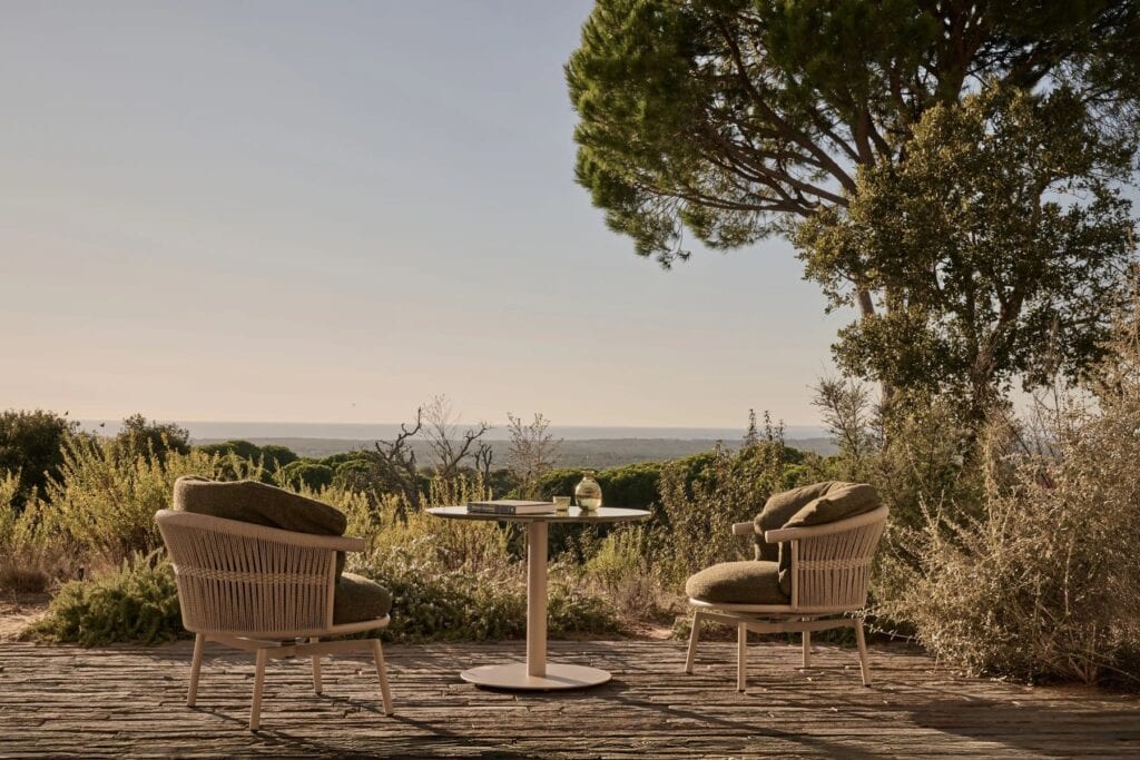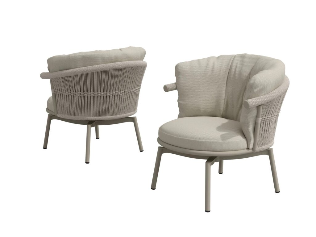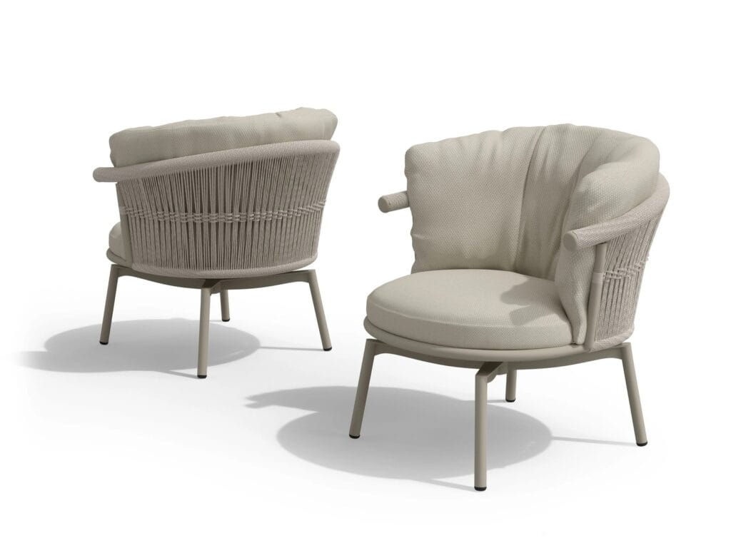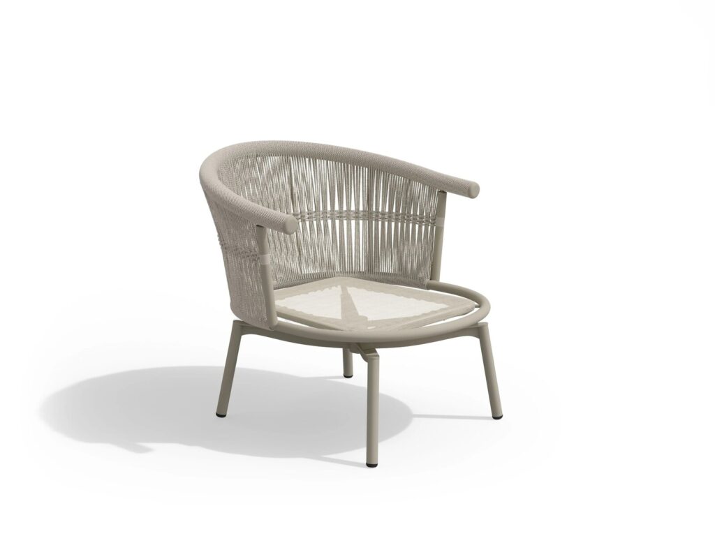 Cesta is a padded aluminum chair with a woven backrest that extends into the armrests.