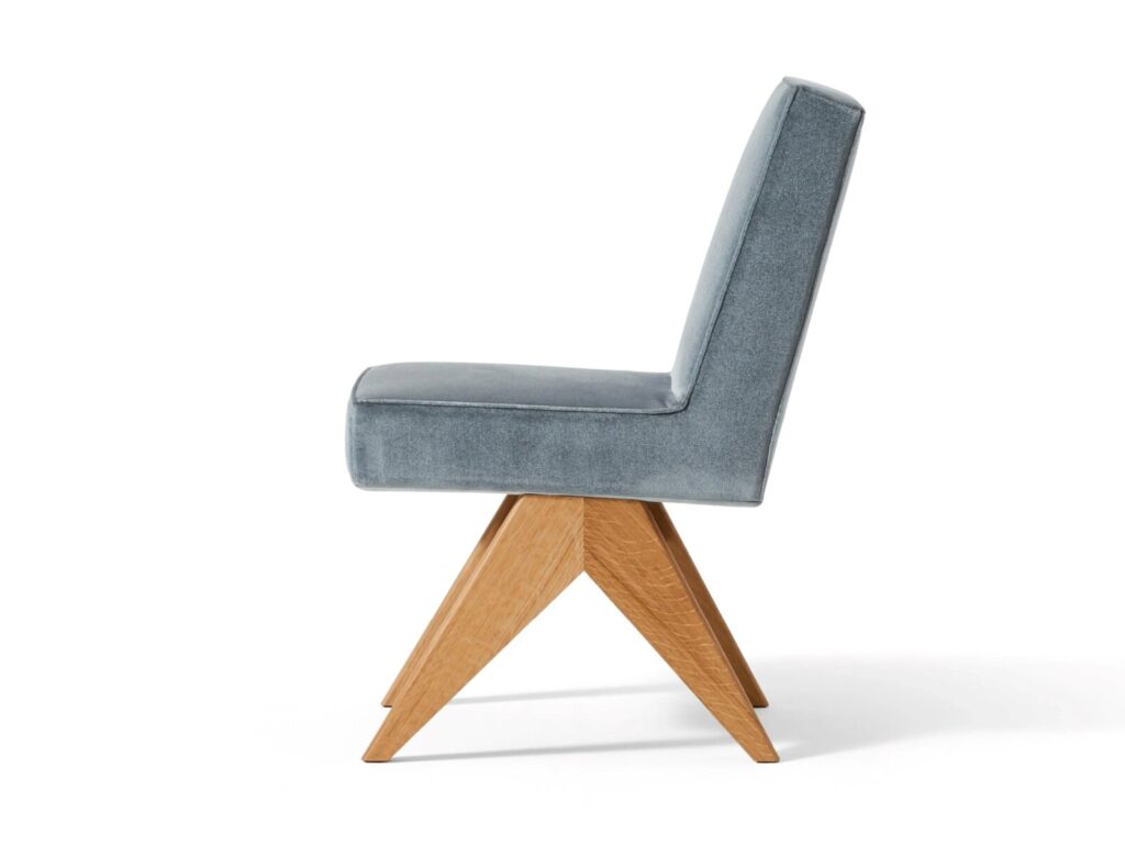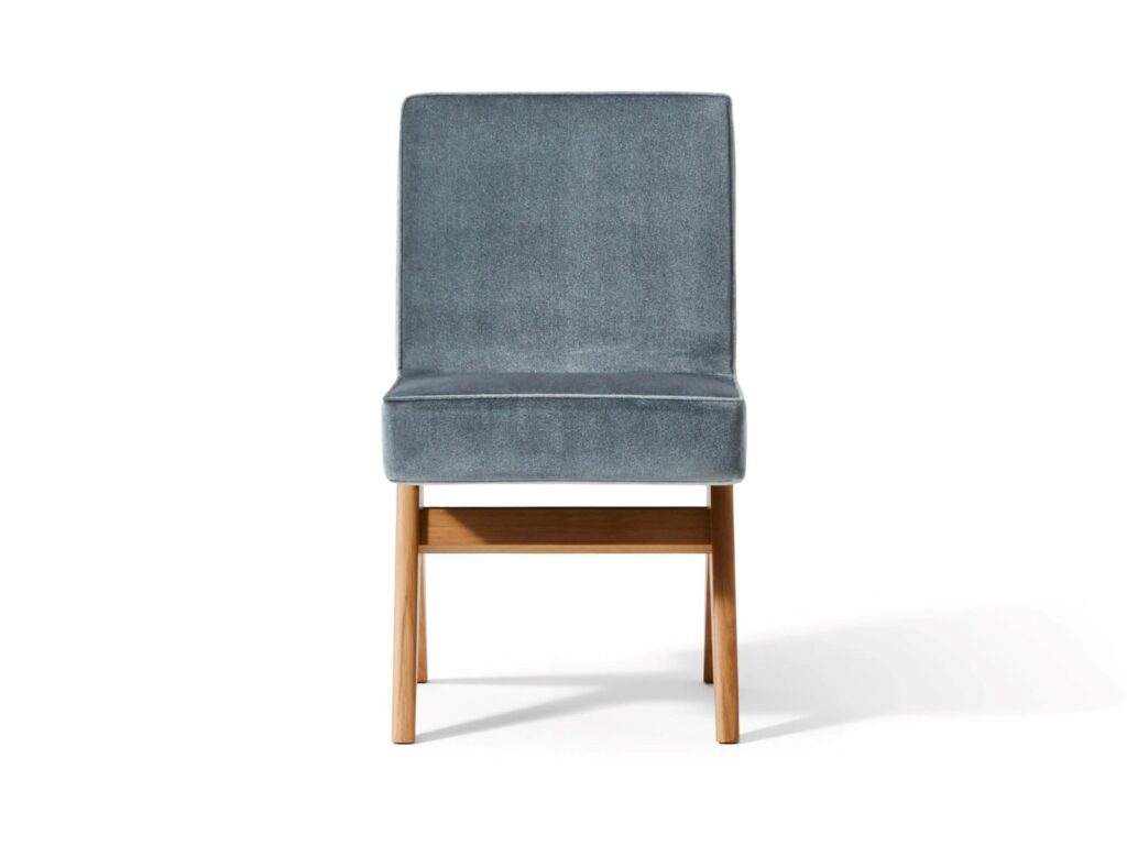 Committee: Der Armlehnstuhl aus der Hommage à Pierre Jeanneret-Kollektion zeichnet sich durch seine eleganten, starken Linien und das Gestell aus Massivholz mit den ikonischen Seitenstützen in Form eines umgekehrten "V" aus. Der Committee Chair wird in seiner ursprünglichen Version und in einer neuen Interpretation ohne Armlehnen präsentiert, um sich flexibel sowohl an Wohn- als auch an Essbereiche anzupassen.