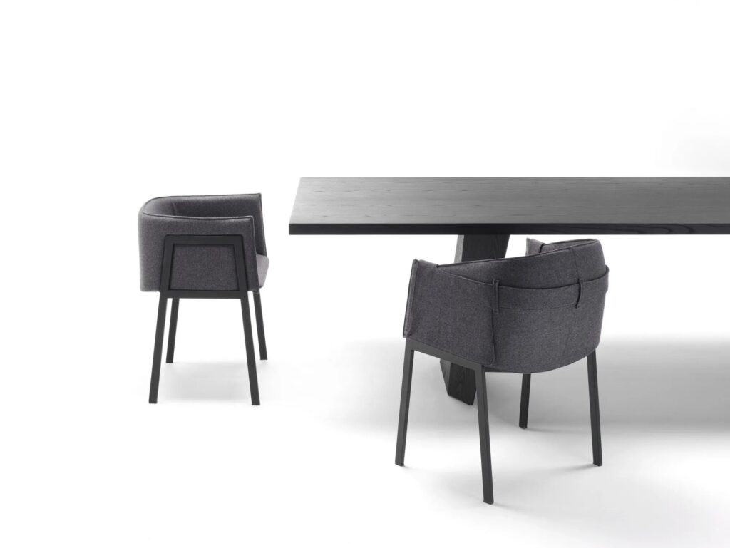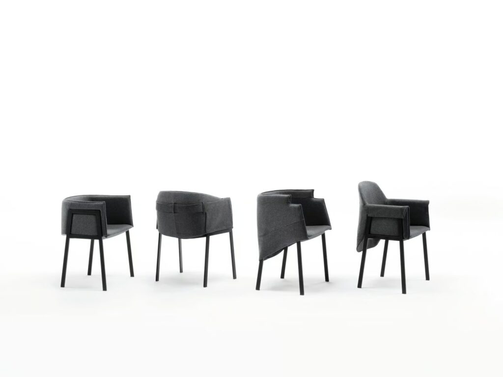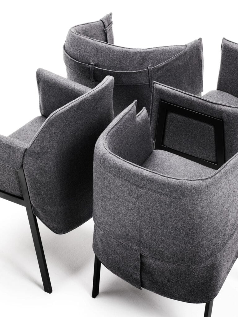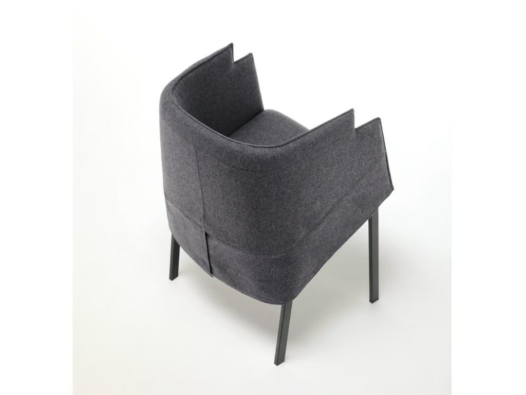 GRACE COLLECTION ist eine Familie von 4 verschiedenen kleinen Sesseln mit einem Gestell aus Stahl mit rechteckigem Querschnitt, mit schwarzer Epoxid-Pulverbeschichtung RAL - K7 9017 mattschwarz. Schale aus einteiligem Rahmen mit Stahleinlage und flexiblem, kaltgeschäumtem Polyurethanschaum. Sitzrahmen aus gebogenem Pappelsperrholz, gepolstert mit Polyurethanschaum. Bezug aus 100 % Polyäther, thermisch auf einen Polyamidsamtrücken geklebt. Stoff- oder Lederbezüge, die für jeden Stuhl individuell angefertigt werden und durch Reissverschlüsse und Klettverschlüsse vollständig abnehmbar sind, nachdem das Gestell vom Tragrahmen abgeschraubt wurde.