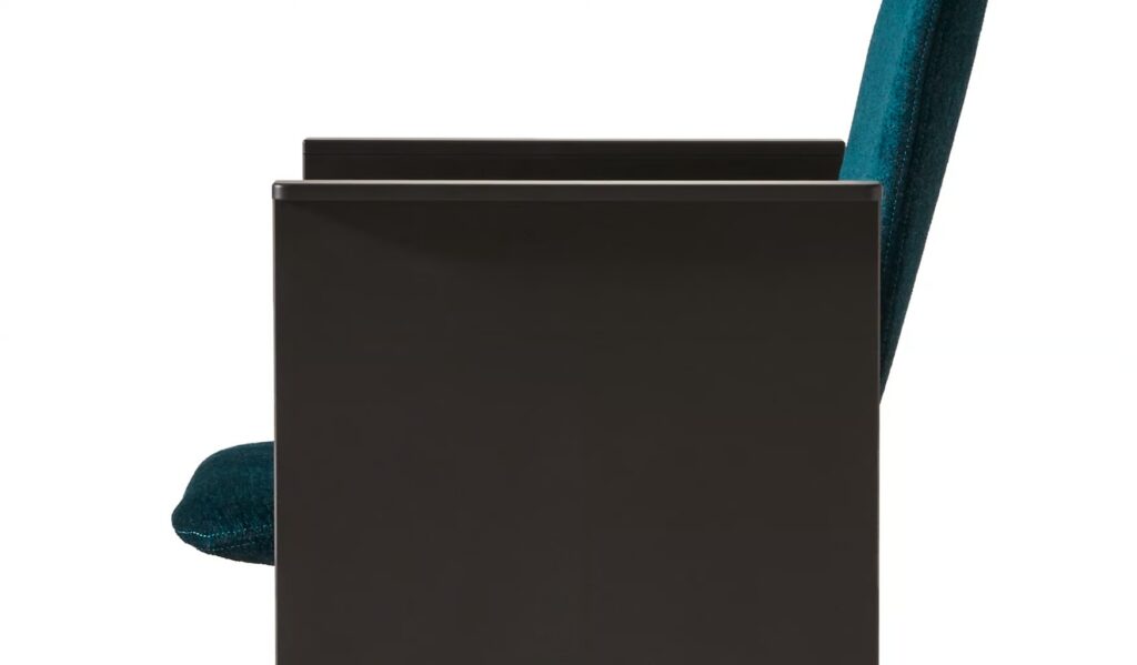 Die Armlehnen des Designer-Stuhls Flutz bestehen aus zwei dünnen Aluminiumplatten, die durch eine unsichtbare Platte verbunden sind, deren Aufgabe es ist, dem Untergestell Stabilität zu verleihen und die Sitzfläche zu stützen, die zu schweben scheint.