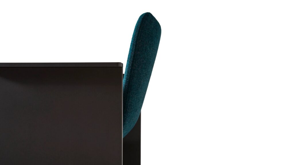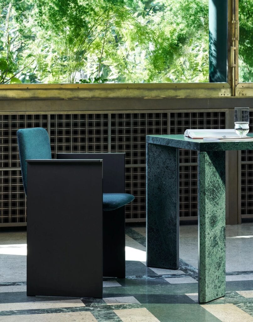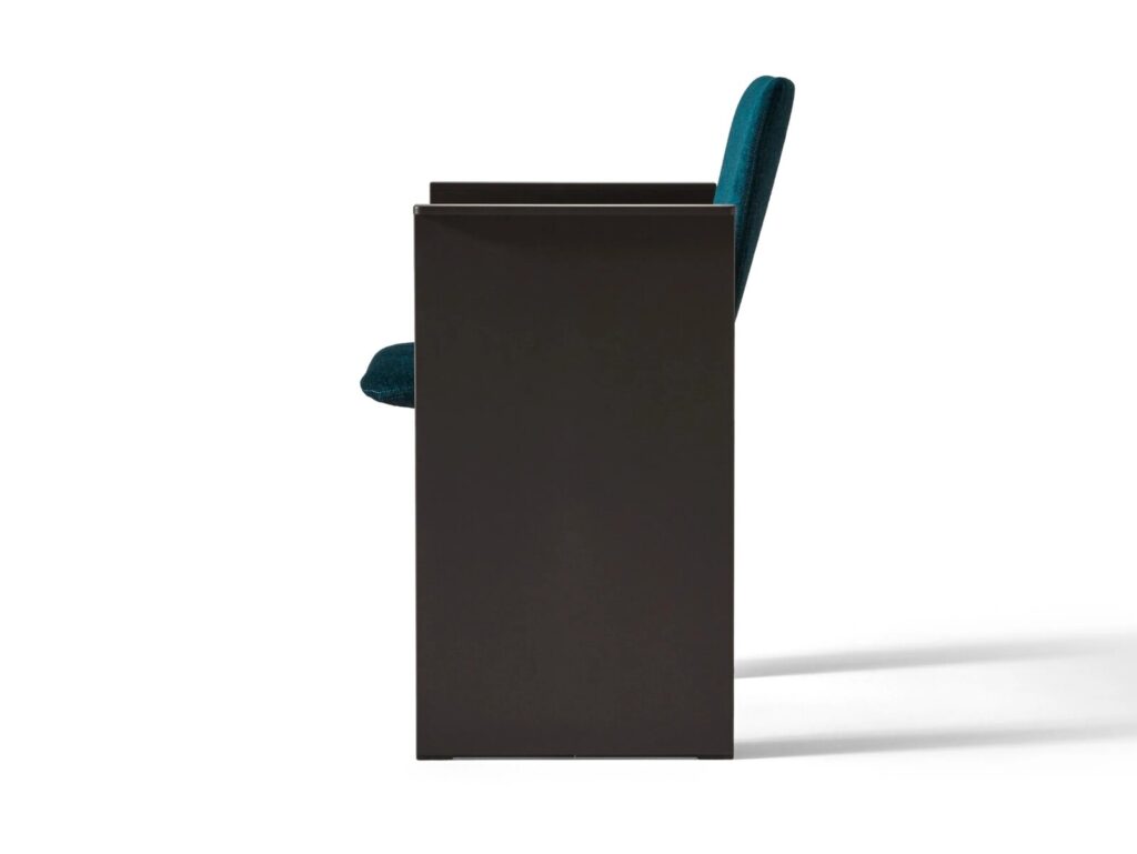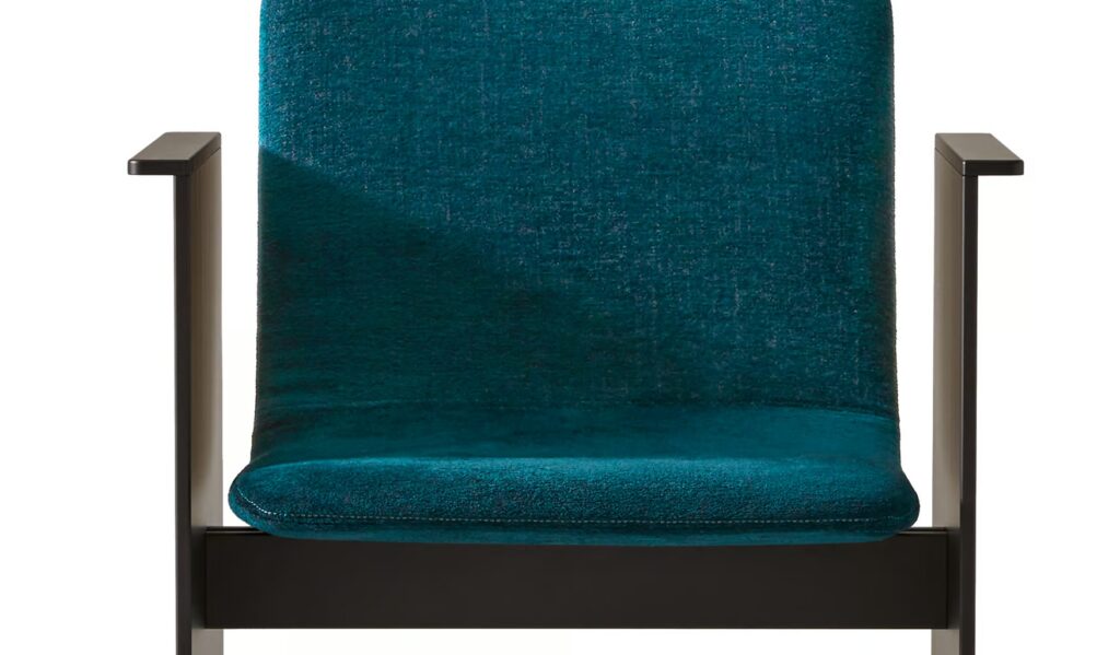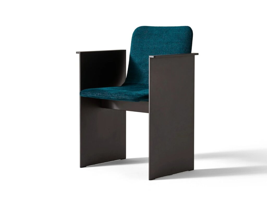 Flutz: Ein Stuhl mit Armlehnen, der von Michael Anastassiades wie ein Oxymoron entworfen wurde, mit einem strengen Metallgestell, das eine bequeme und einladende Sitzfläche aufnimmt. Die Inspiration: Die eleganten und tadellosen Gesten des Eiskunstlaufs.