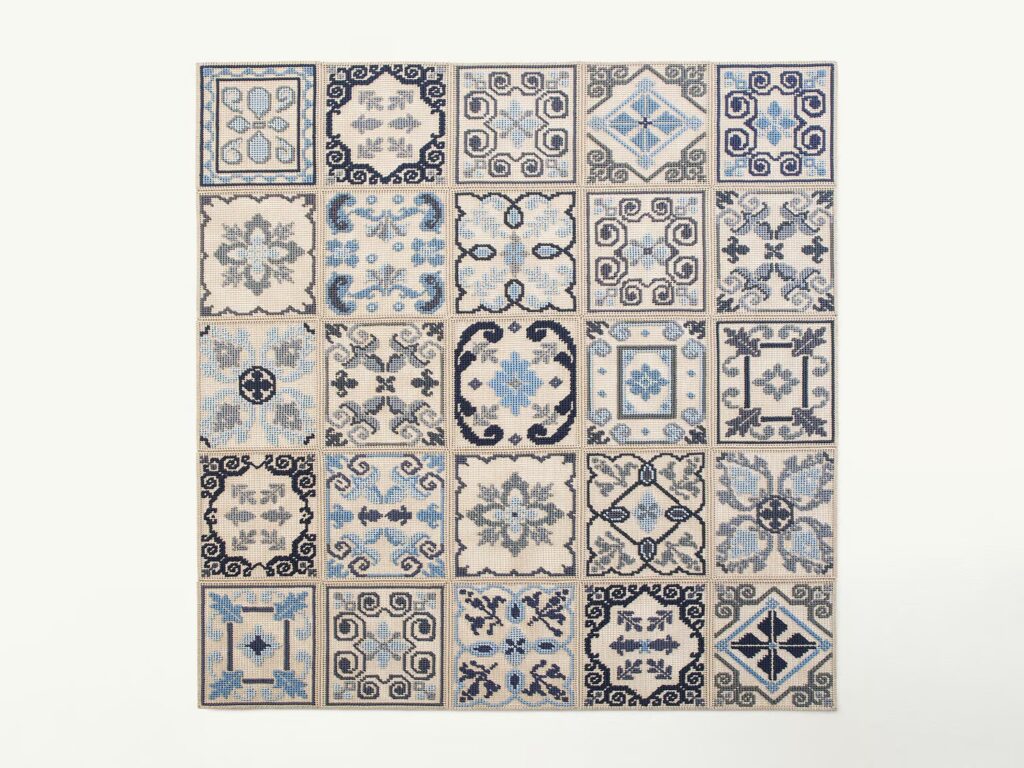 DONNA COSTANZA/FLORIO sind modulare Teppiche, die aus 50x50 cm großen, handgestickten Elementen bestehen. Die Dekoration wird mit einem ein- oder zweifarbigen Flachgeflecht aus Rope-Garn auf einem Netz in Sandfarbe hergestellt. Die Module werden dann von Hand mit einem Band aus demselben Material und in derselben Farbe wie das Netz verbunden. Donna Florio weist zwei Muster auf, eines für den zentralen Teil des Teppichs, das andere für den Rahmen. Die Module, aus denen der Teppich Donna Costanza besteht, sind dagegen alle unterschiedlich.
