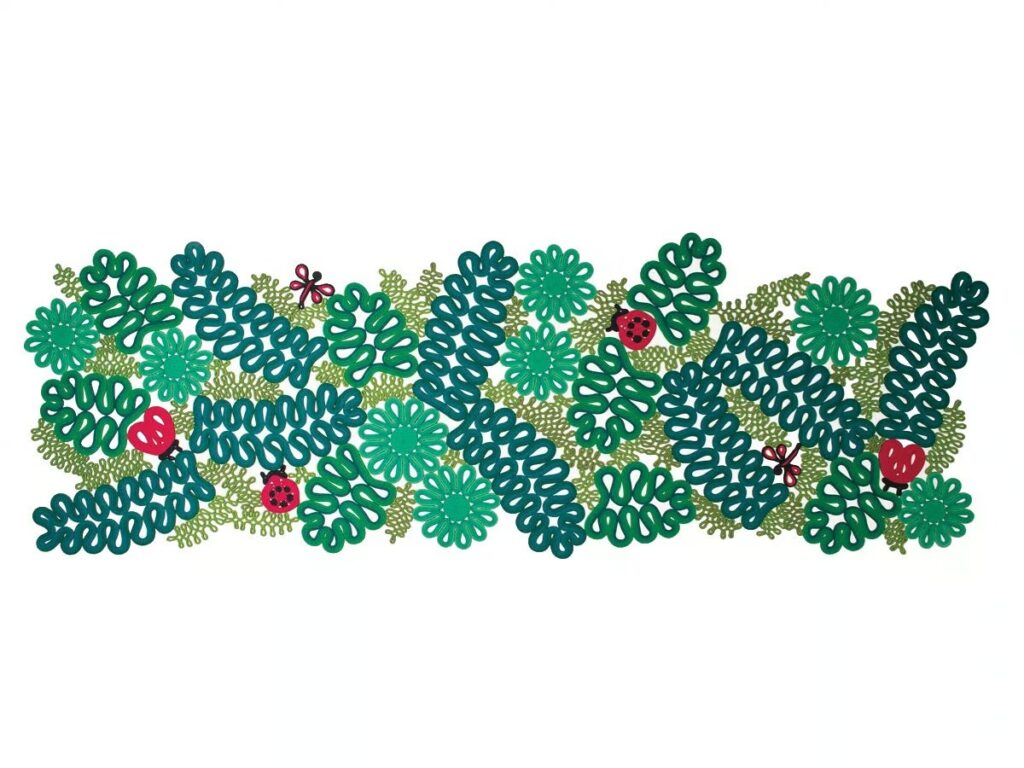 Der Teppich LADYBIRD ist komplett handgefertigt. Die Oberfläche des Teppichs besteht aus Elementen, die mit ein- oder zweifarbigen Kordeln aus Rope-Garn hergestellt werden. Die Kordeln werden von Hand geformt, um Pflanzen und Tiere nachzubilden. Die Elemente werden dann zu einer großen Dekorationsfläche zusammengenäht. Die textile Struktur dieses Teppichs ist frei. Ein intensives Treten kann zu einer Veränderung der Maße des Teppichs führen. Aufgrund der Handarbeit und der Kostbarkeit der Motive rät Paola Lenti davon ab, Ladybird in stark frequentierten Bereichen zu verwenden. Der Teppich LADYBIRD eignet sich auch hervorragend als Wanddekoration.