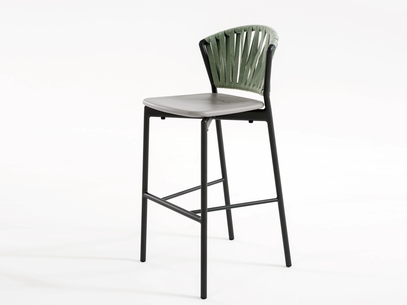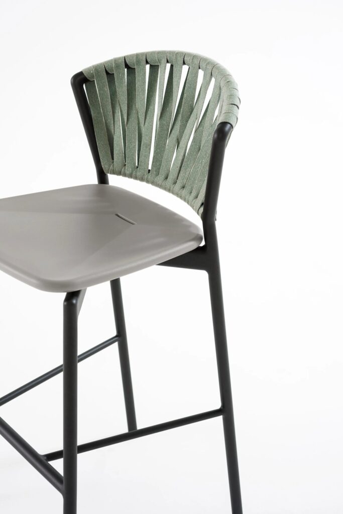 Piper150 ist ein hoher Hocker aus Aluminium mit Sitz aus Harz, ideal für moderne Küchen, Bars und Restaurants oder jede andere elegante Umgebung, die der Gastfreundschaft gewidmet ist. Das beschichtete Aluminium der Struktur findet gültige Kombinationen mit den Nuancen der Gurte, die die bequeme Rückenlehne umhüllen, von Unifarben bis hin zu den Melange-Farben der recycelten Acrylgarne. Eine praktische und glückliche Möglichkeit des Mix & Match, die dank der Forschung von Materialien und der Studie von neuen Oberflächen, mit Design-Kontinuität wächst.
