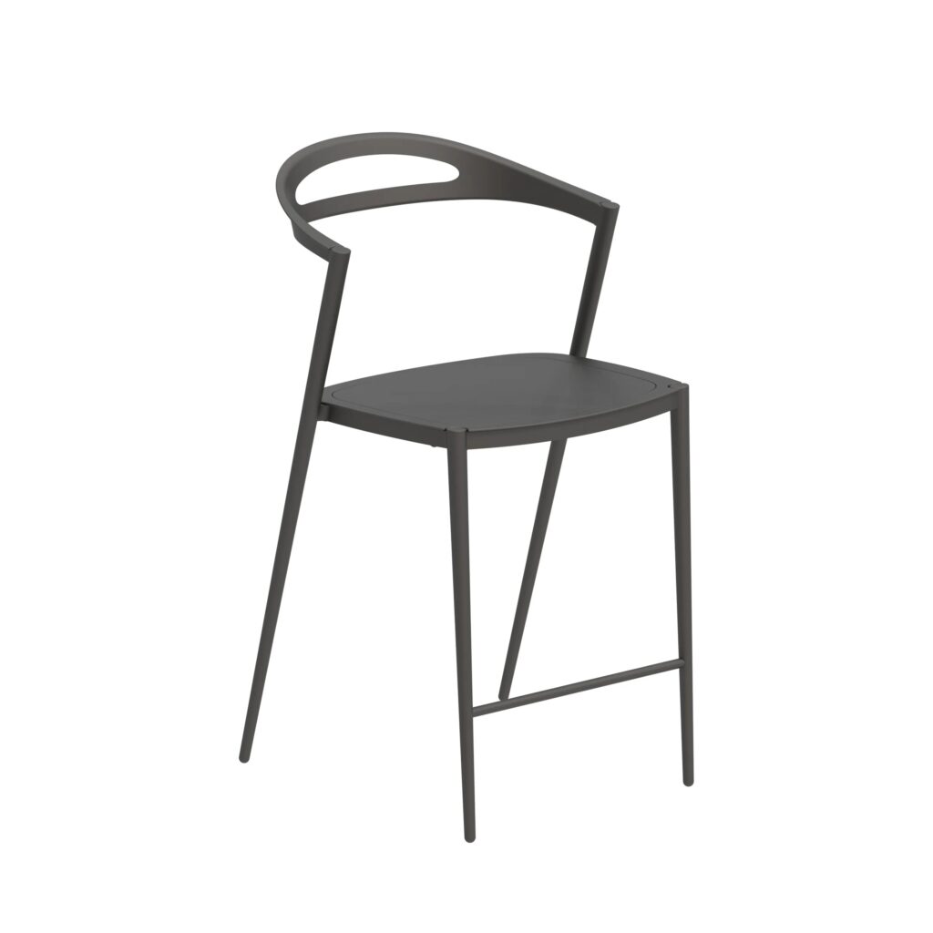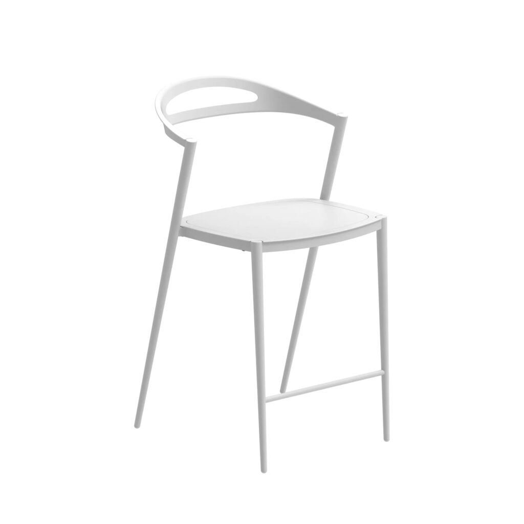 Styletto ist ein beschichteter Aluminiumhocker mit Fussstütze und Rückenlehne. Erhältlich in einer Version mit integriertem Kissen.
